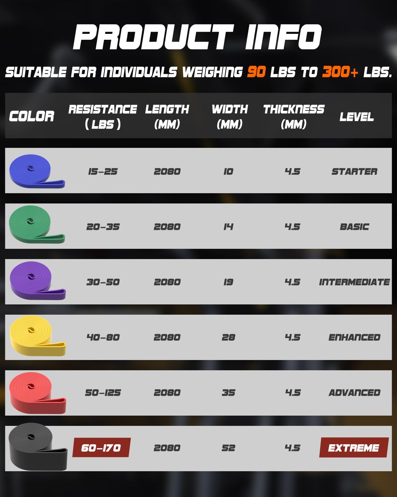 - Pull Up Bands 15-170 LBS:Blue (15-25 lbs), Green (20-35 lbs), Purple (30-50 lbs), Yellow (40-80 lbs), Red (50-125 lbs), and Black (60-170 lbs). Ideal for users weighing 90 lbs to 300+ lbs Pull Up Bands 5-80 LBS: pink (5-15lb), light purple (15-35lb), light blue (30-60lb), and dark purple (40-80lb)