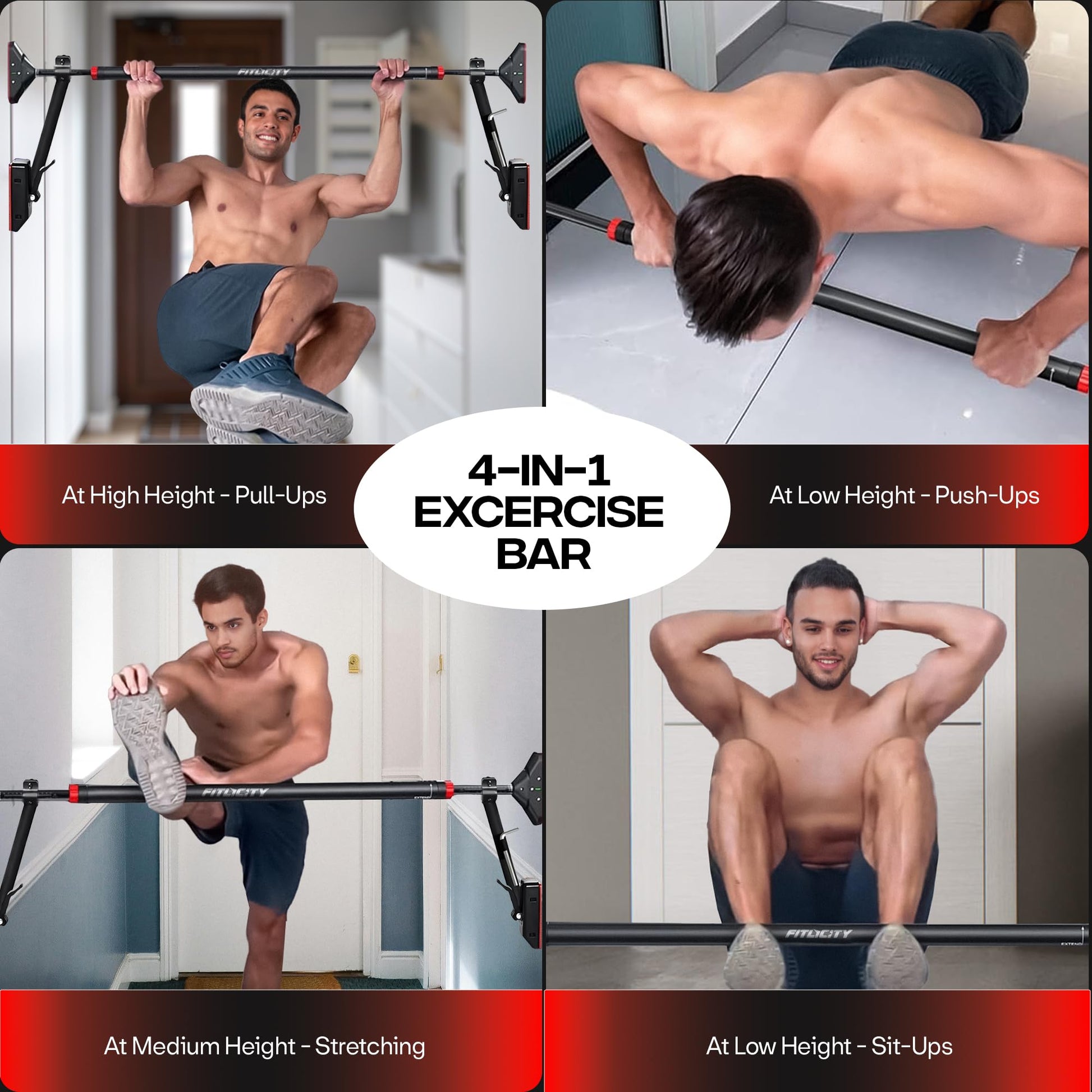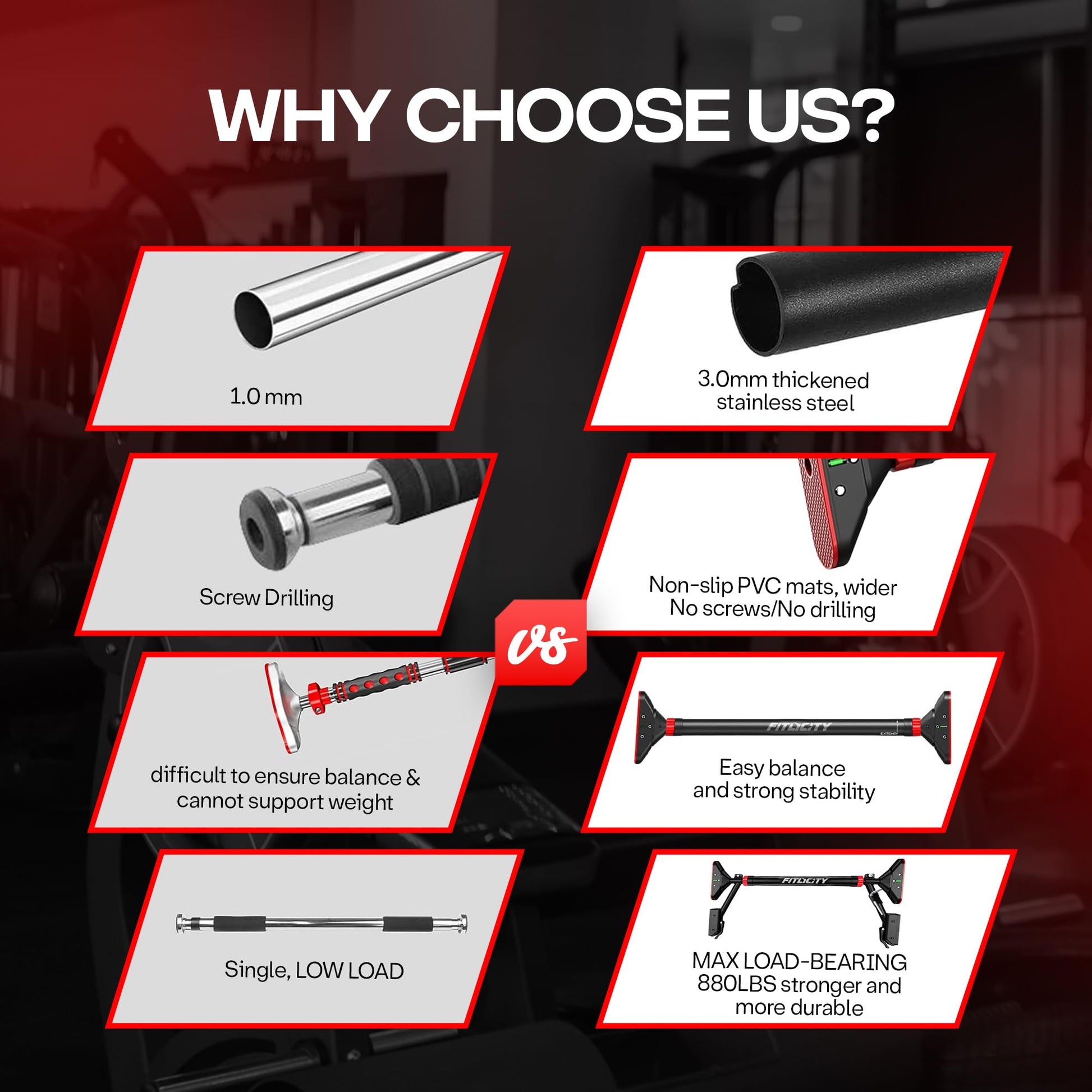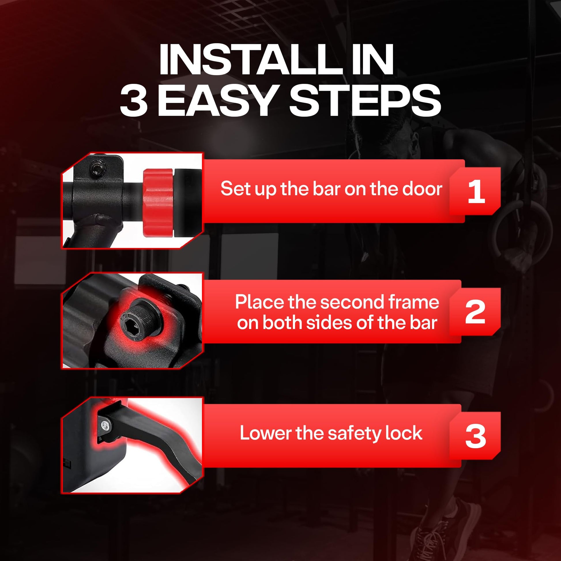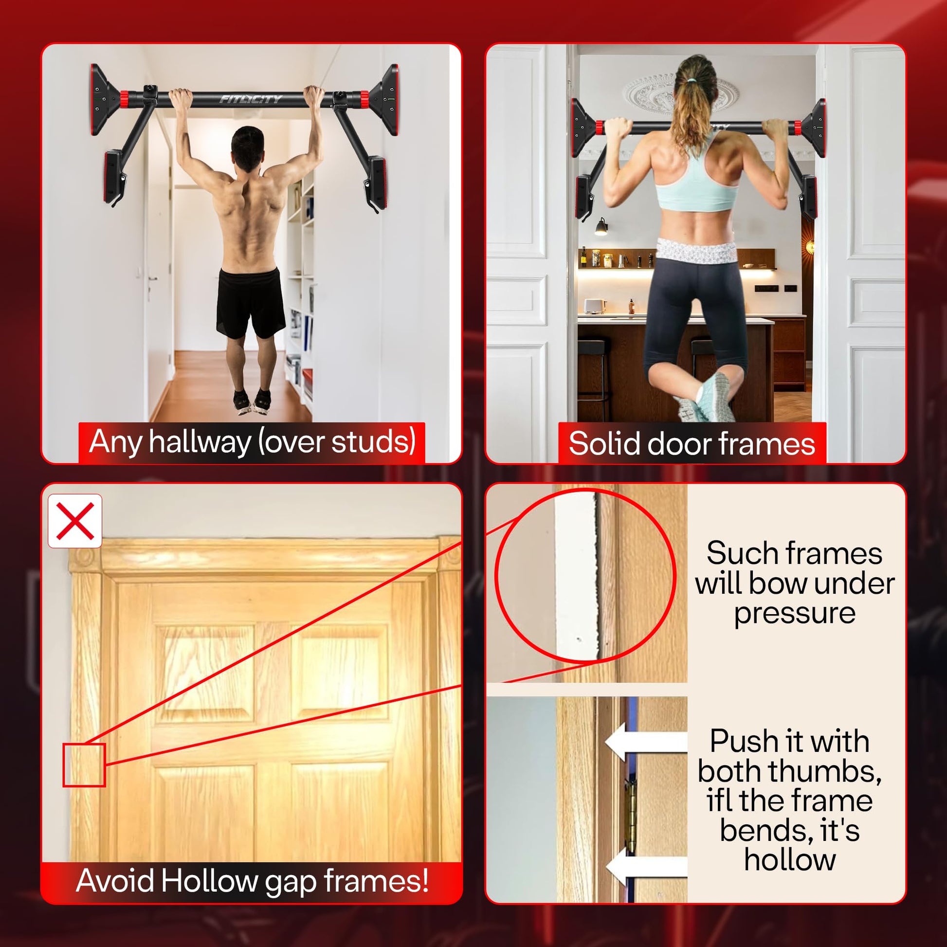 - ✅EFFORTLESS INSTALLATION: With the Fitlicity pull-up bar for doorway, setting up your home gym is a breeze. No drilling or screws required; simply install the bar in your preferred location. Great for door pull-up workouts or as a chin-up bar doorway no-damage solution.
