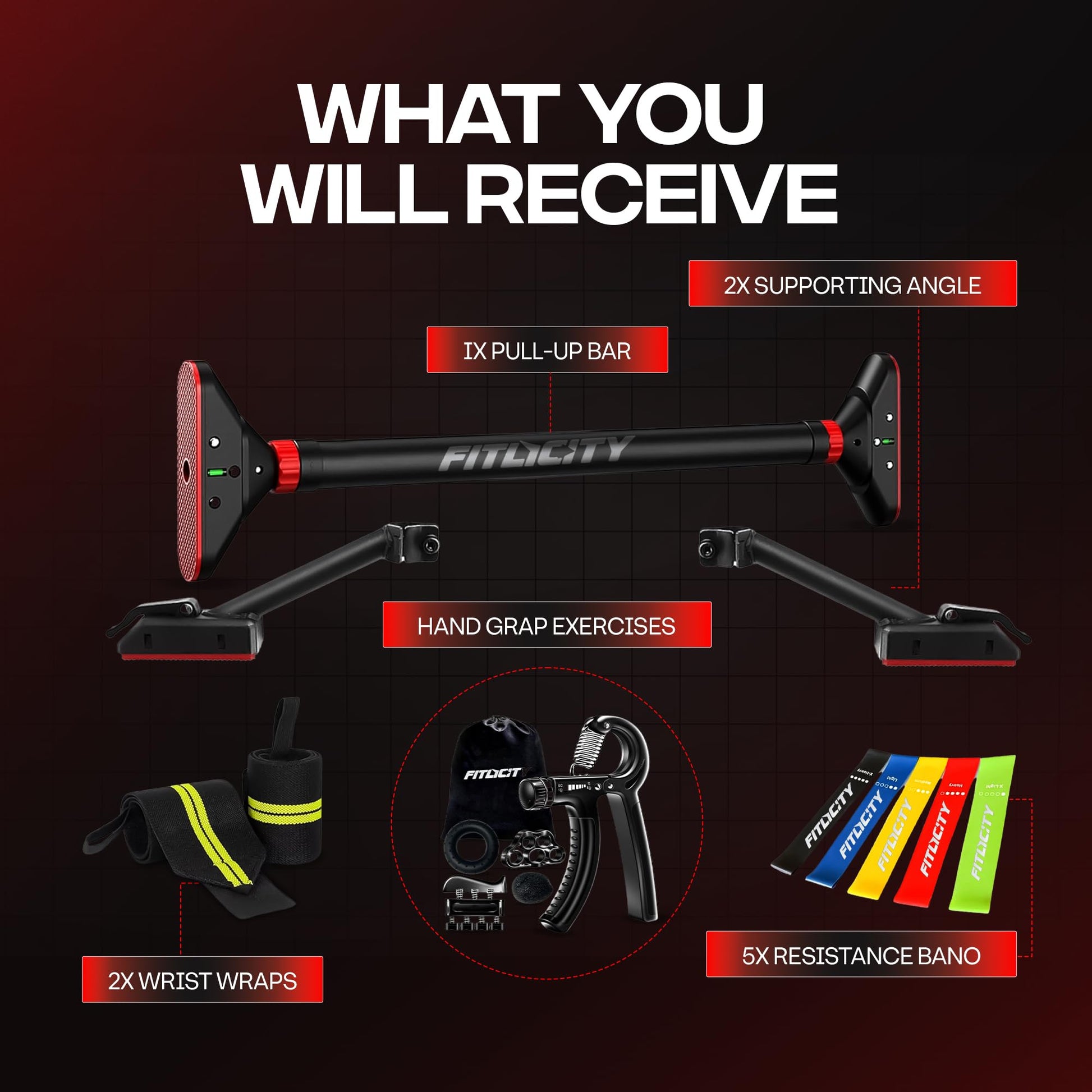 Fitlicity Pull Up Bar for doorway With Hand Grip Strengthener & Resistance Bands, Chin Up Bar for Upper Body Workout & Exercise, 29.9" - 37.5" Adjustable Width Locking Mechanism, No Screw Installation, 880 lbs