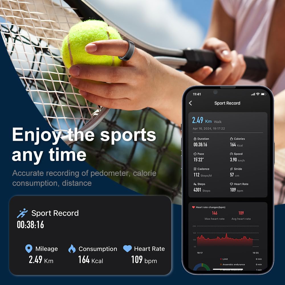 - 【Combined Health & Fashion】Bring the elegance to your finger,not only intelligent but also comfortable and effortless,with aluminium material,wear-resistant,corrosion-resistant.The smart ring can accurately track steps,distance,calorie counters, whether it's indoor/outdoor running, treadmills,or fitness walking.