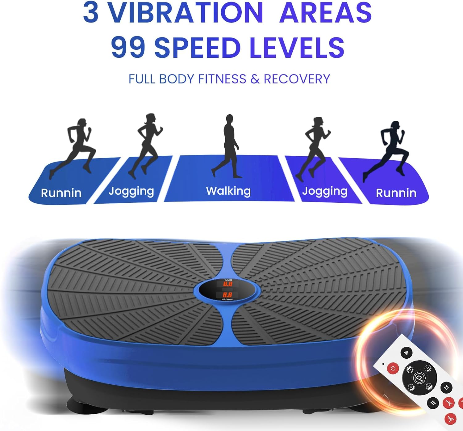 - 99 ADJUSTABLE VIBRATION SPEEDS: Vibration plate speed range from 1 to 99, with 99 having the maximum intensity to suit different needs, remote easily controls the speed at the click of a button, and 15 minutes on this vibration platform equals 1 hour of jogging