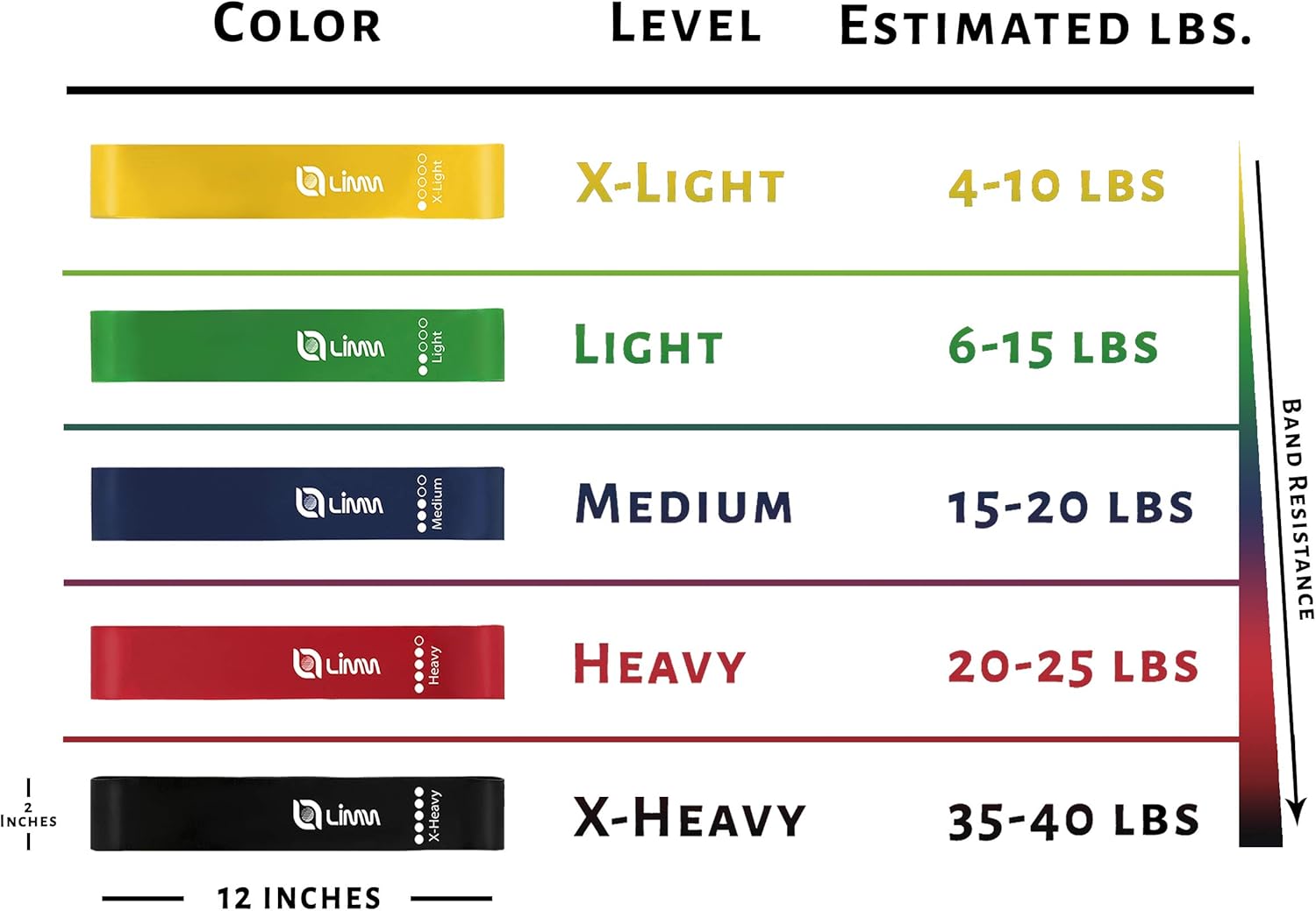 - WHAT YOU GET: A set of five color-coded and portable exercise band set with an instruction guide, carry bag, and an unlimited number of ways to bring more challenge to your workouts!