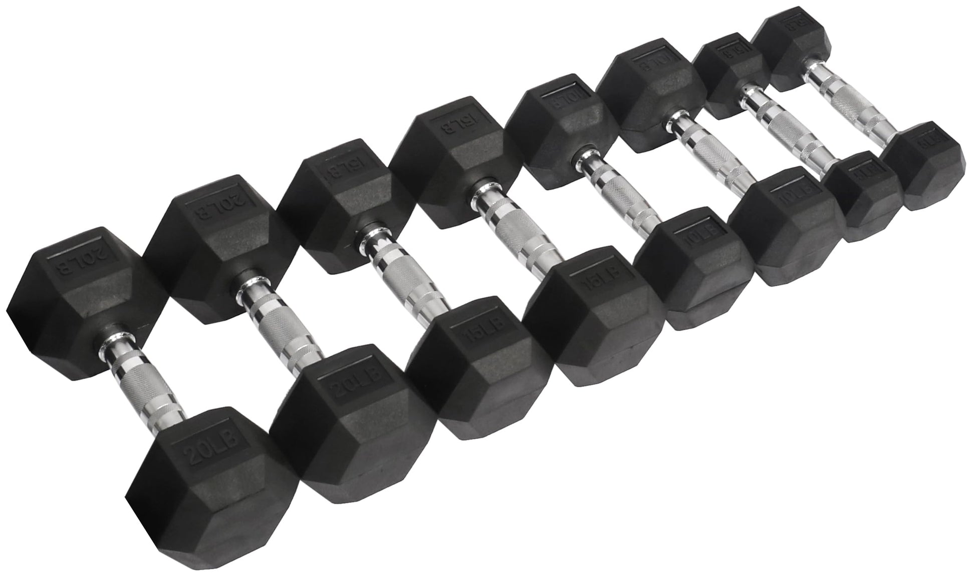 Details: Fitvids Rubber Encased Hex Dumbbell, Set Including 5, 10, 15, 20LB Pairs