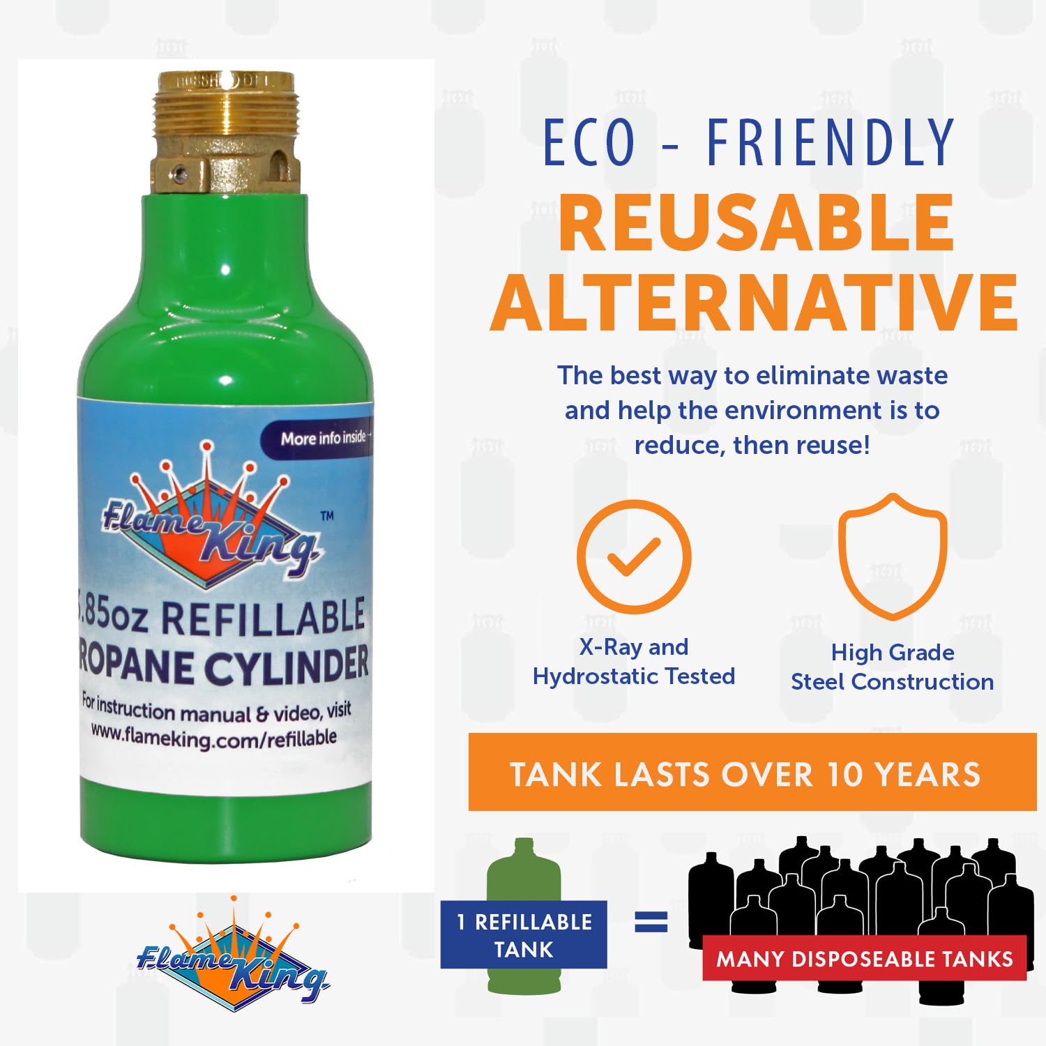 - REDUCE WASTE - Join the eco-revolution! Keep disposable propane tanks out of the environment by using the Flame King 3.85 oz refillable cylinders