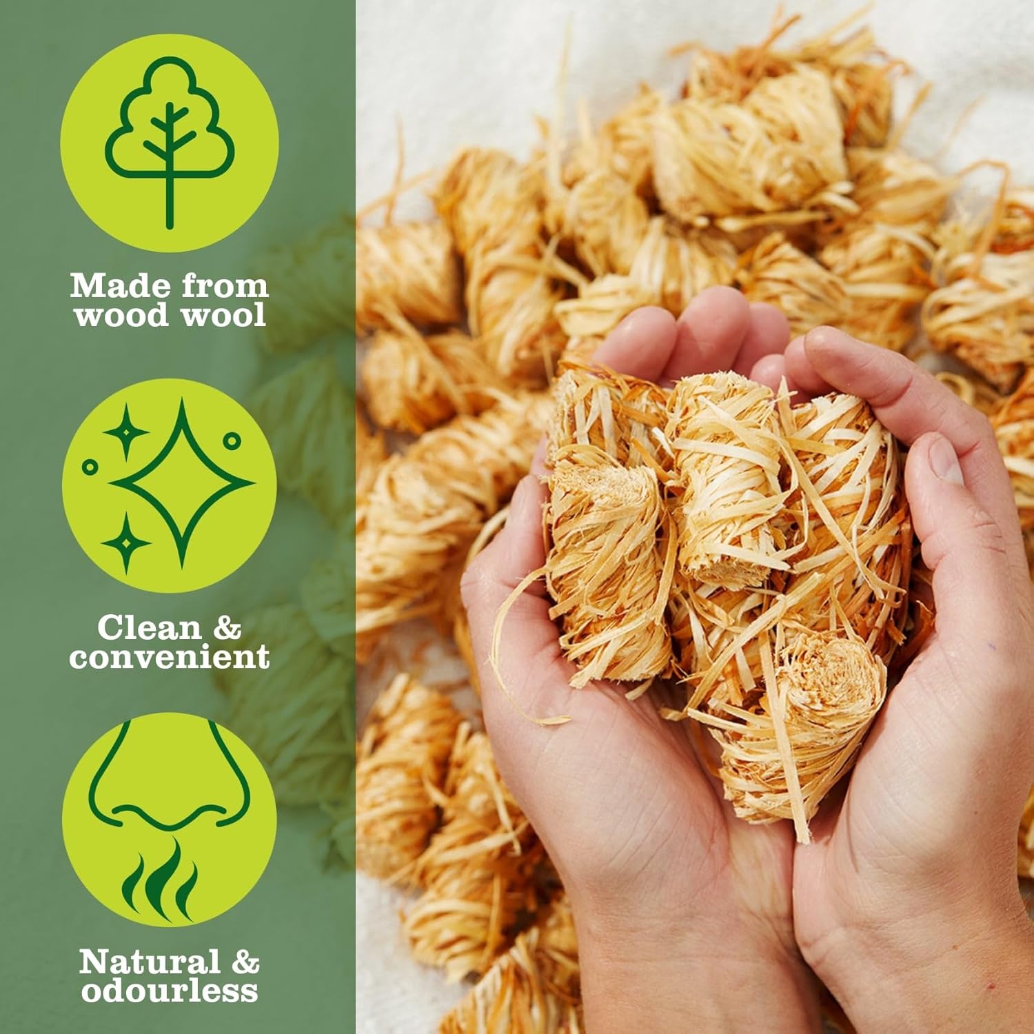 - Long Burn Time: Ignite larger pieces of firewood sticks or logs with our natural fire starters for wood stove which provides a steady, sustained flame. Made from sustainable & untreated wood shavings, this firestarter lights easily and even when wet.