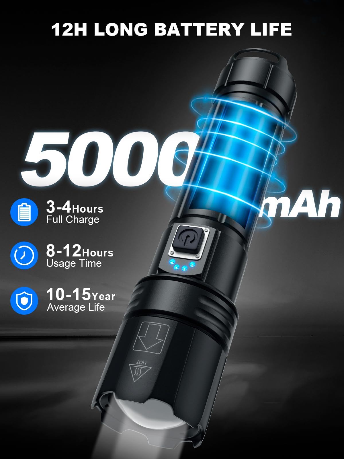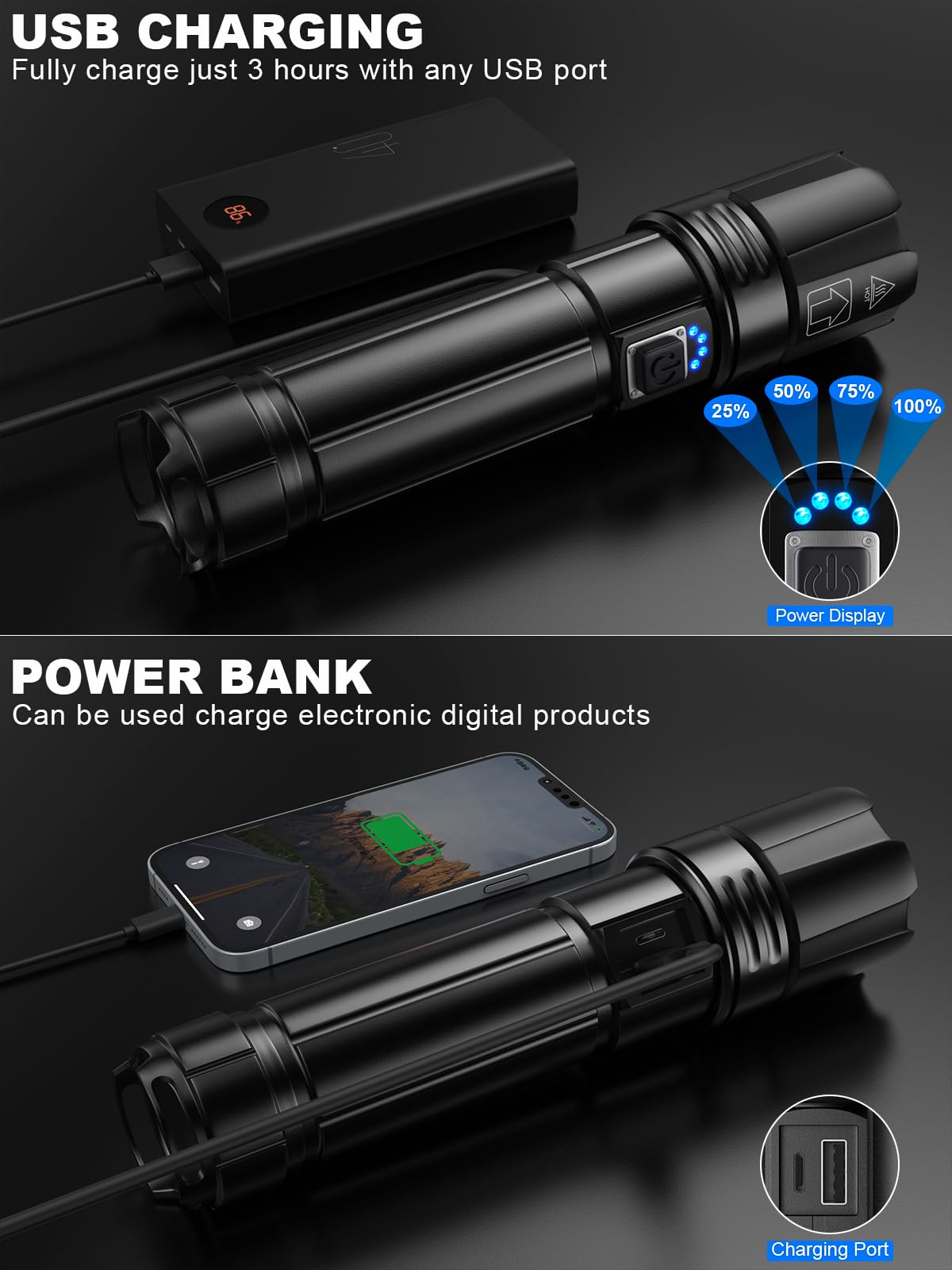 - 【USB Rechargeable & Energy Conservation】LED flashlight high lumen rechargeable with a large capacity of 5000mAh Βattery (included) uses USB for fast charging, which is very energy efficient and environmentally friendly. Flashlights usually take 3-4 hours to charge and can be used for 8-12 hours, with each power state representing 25%.