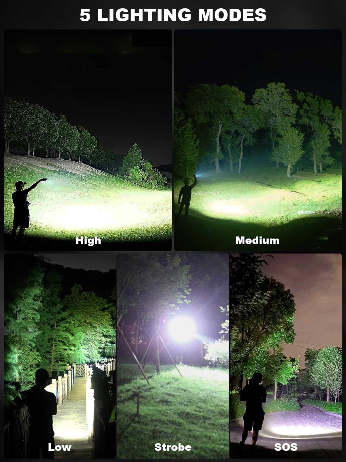 - 【5 Lighting Modes & Adjustable Focus】Our high-lumen rechargeable flashlight comes in 5 modes (high/medium/low/flash/SOS), press the 3S button to turn off all modes. The brightest flashlight ever made has adjustable focus, and we have adjusted the grid lines to a maximum range of 3280 feet for clearer remote viewing.