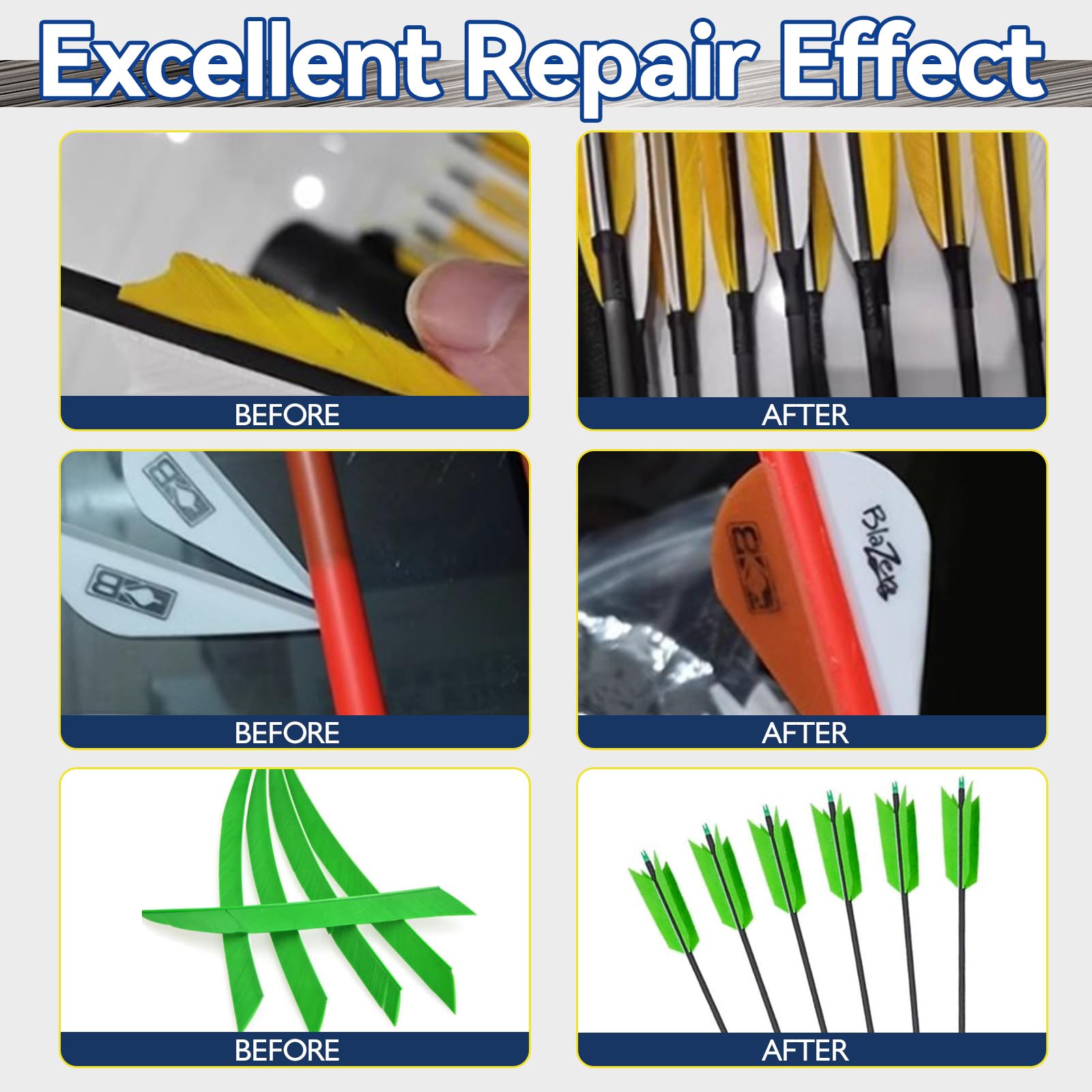 - Easy to Use: Keep the repair surface clean and dry before use. After applying the clear fletching glue, press and hold both repair surfaces for 45 seconds for initial curing. Wait 24 hours for optimum bonding