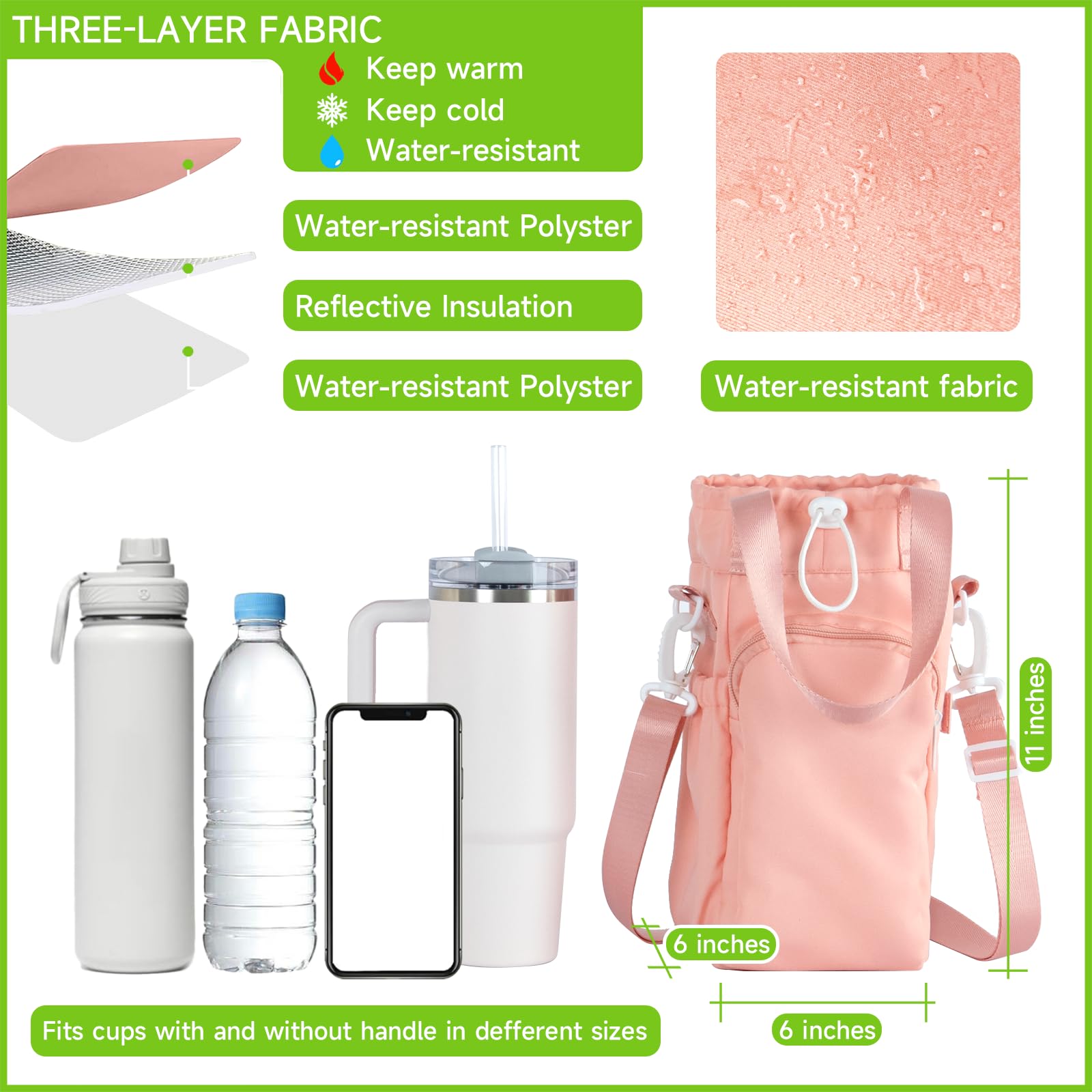 - 🥤 Large Capacity & Adjustable shoulder strap: With dimensions of 5" x 5" x 11", our water bottle sling bag accommodates a wide range of vacuum bottles, sports bottles, and feeding bottles, ranging from 30oz to 40oz. Featuring detachable handles and an adjustable shoulder strap, our bottle carrier provides two convenient ways to carry it. Whether in hand or across your body, it suits all body types.
