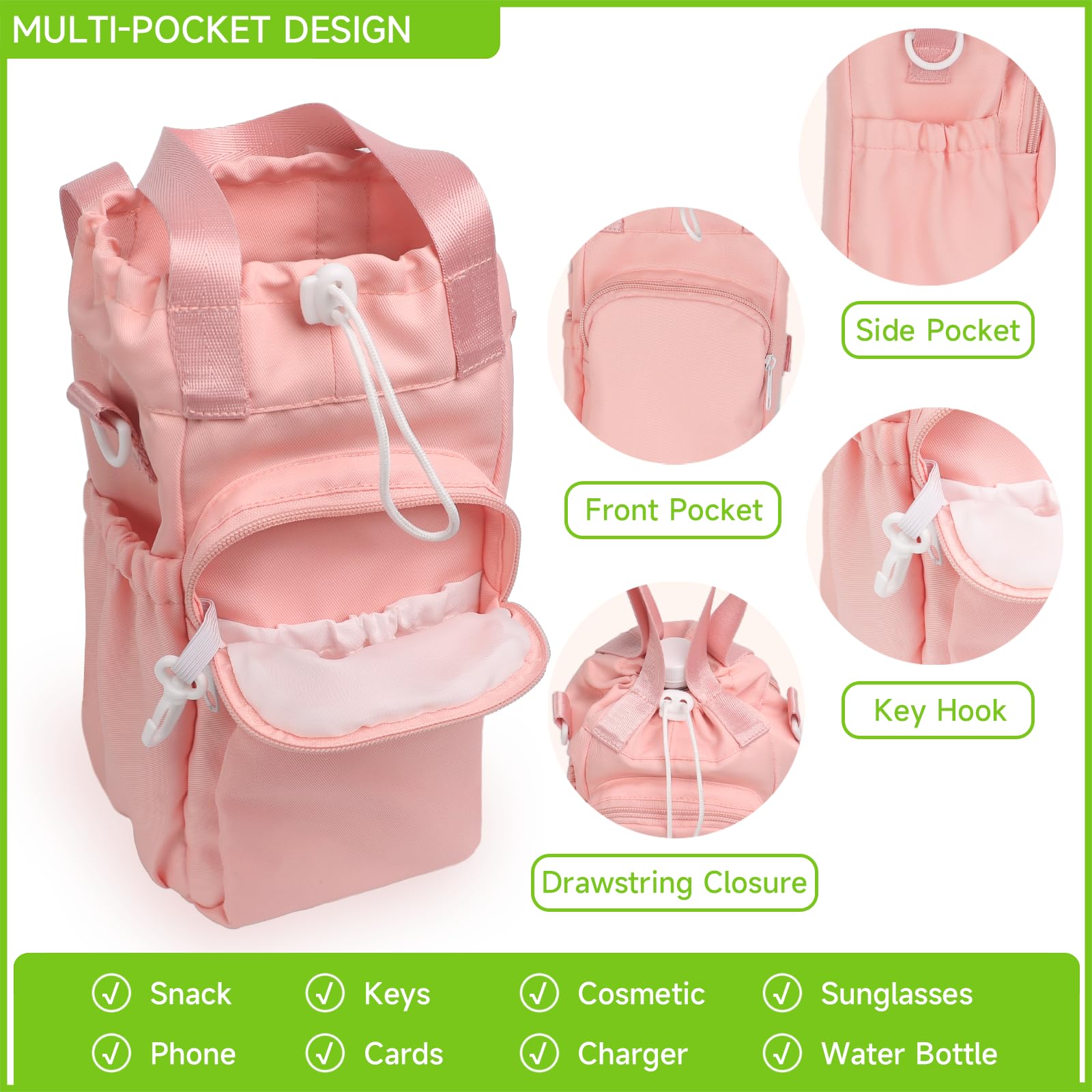 - 🥤 Multiple Pockets: Our water bottle sling carrier offers ample space for your essentials. The main pocket with a drawstring closure easily accommodates your bottle, while a front phone pocket with a key hook and interior compartment keep your smartphone, cards, keys, and more. a slip-in side pocket is perfect for snacks or tissue.