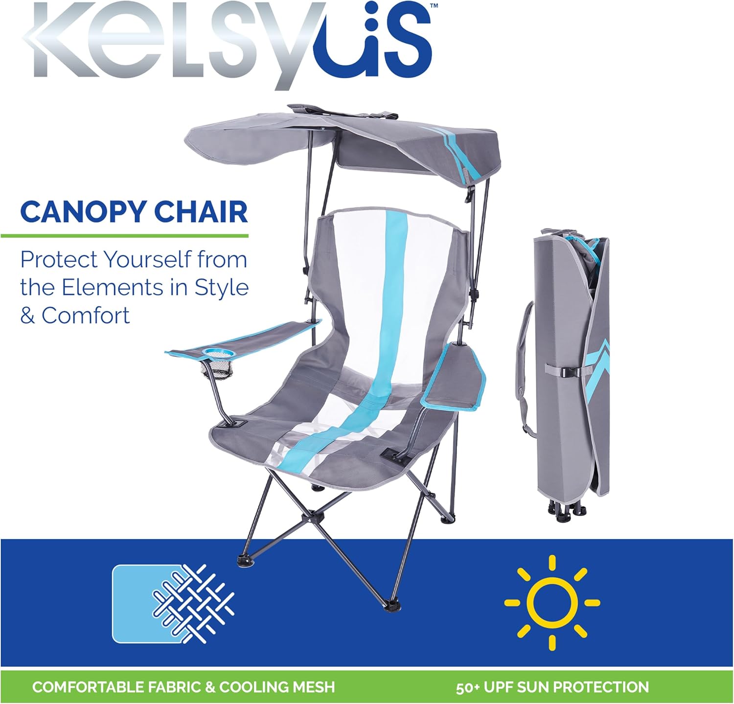 Protect yourself from the elements with the Kelsyus Original Foldable Canopy Chair. This portable camping chair converts from a familiar quad-style camp chair into your own personal canopy-covered outdoor oasis. The retractable sun canopy protects you from the elements with 50+ UPF sun protection, and it can be lowered behind the chair while you are still seated when you want to catch some rays. The large cup holder with o-ring provides stability and convenient access to your favorite drink, while the oversized arm rests offer added comfort. The canopy becomes the carry case when folded secured by a durable snap-lock buckle, and the attached shoulder strap provides hands-free portability - no carrying bag needed! Additional premium features make it the leader of the pack, such as an oversized seat with a rounded front edge for more ergonomic comfort and breathable mesh fabric to keep you cool. The sturdy powder-coated steel frame provides long-lasting durability and can support kids and adults up to 250 lbs. The Kelsyus Original Canopy Chair is the perfect companion for your family camping trips, tailgating, and for watching the kids from the sidelines! One grey and red chair is included measuring 37"L x 24"W x 58"H.