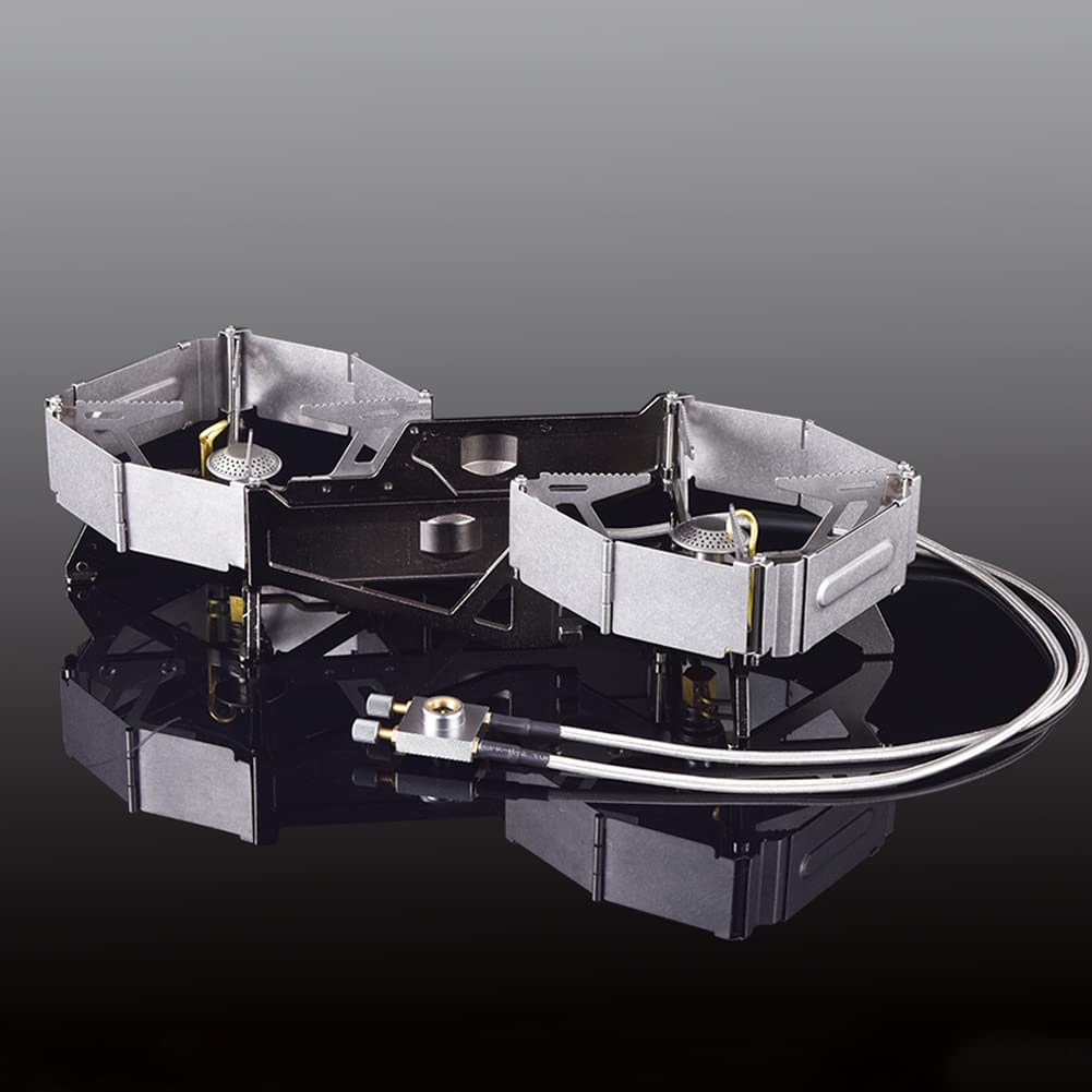 - The double star furnace has stable support and strong bearing capacity, and can be used for small pots with a diameter of more than 6cm. Dual adjustable fire switch, freely control the use of dual burners. Various gas sources (such as butane gas, propane gas, etc.) can be used through adapters.