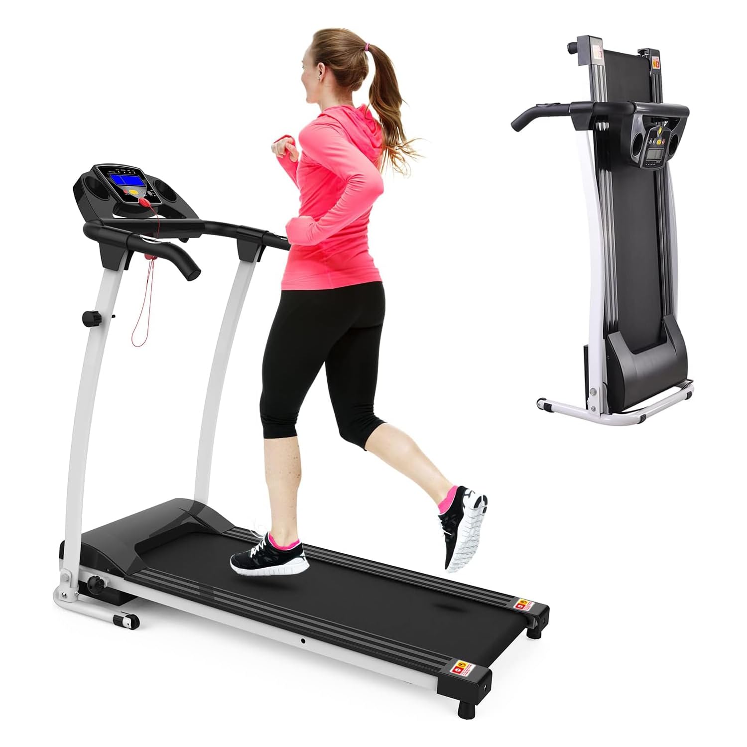 - 💪 Cup Holder & Safety Key: Stay hydrated with 2 water bottle cages conveniently integrated into the foldable treadmill console. The safety key ensures instant shutdown in emergencies, prioritizing your safety during exercise.
