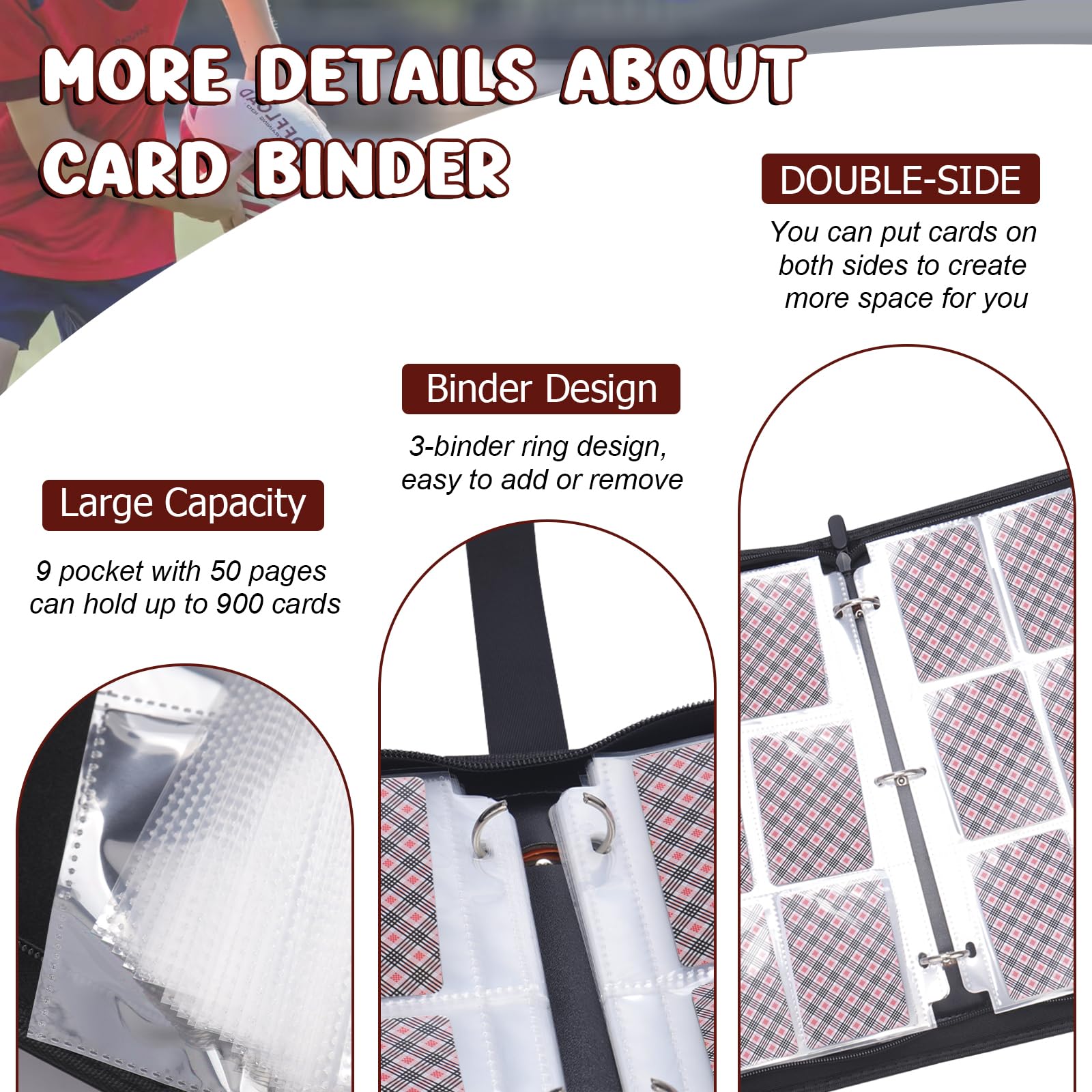 Football Card Binder 900 Pocket, HYMENEX Trading Card Binder 9 Pockets with 50 Removable Sleeves Baseball Card Binder Sports Card Binder with Zipper for Football Card Trading Card Standard Size Card