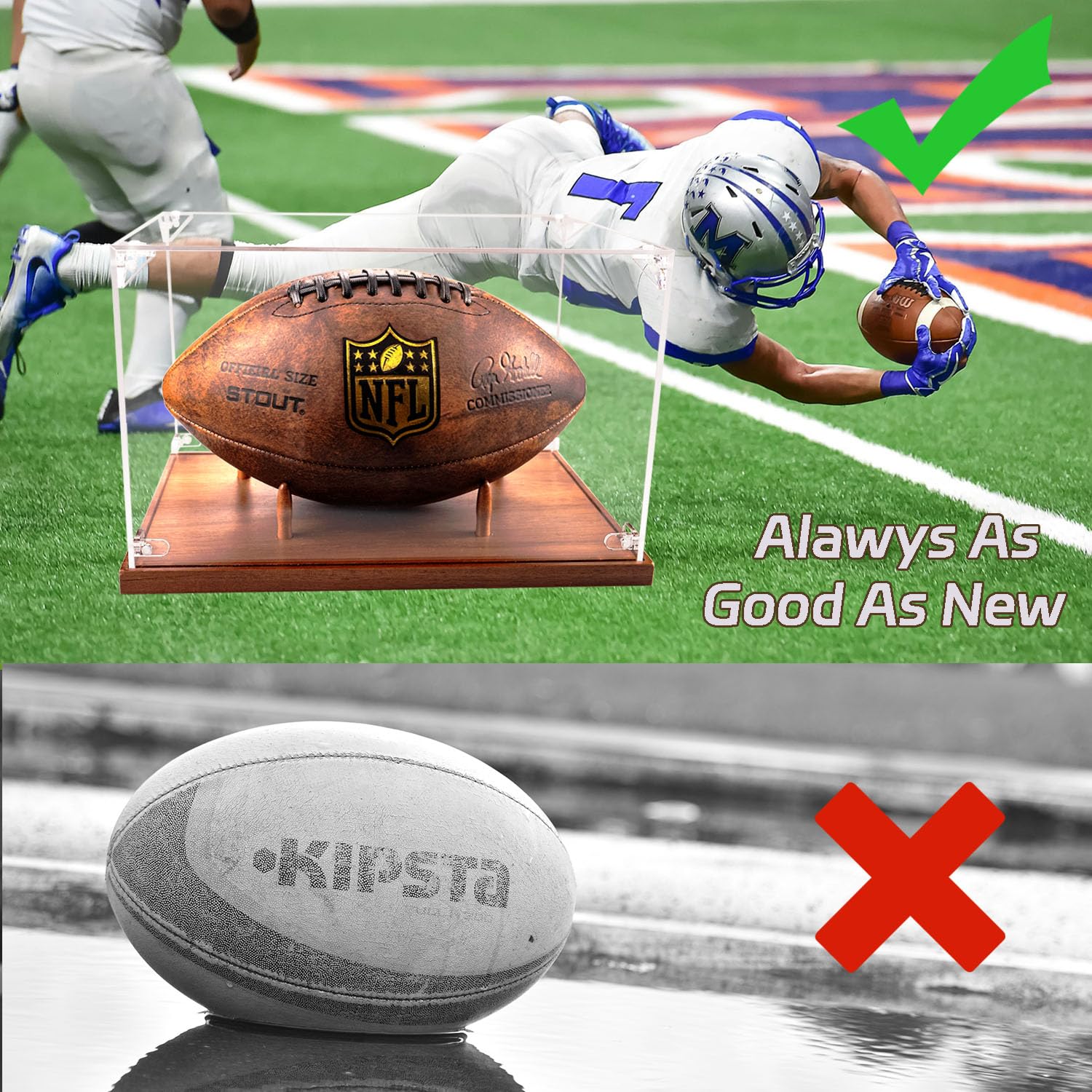 Details: Elevate your cherished football memorabilia with our Premium Football Display Case. This high-quality acrylic football display case offers a crystal-clear, 360° view, ensuring your full-size football is showcased beautifully while protected from UV rays and dust. With dimensions of 14.17" x 8.66" x 10.62", it’s the perfect fit for both signed and collectible footballs. Effortlessly assemble this football case display—just place your football and secure the cover, no tools needed. The detachable wooden stand enhances versatility, allowing you to display not only footballs but other prized collectibles. Its sleek, clear design blends seamlessly with any decor. Ideal for sports enthusiasts, this football case is a standout gift for any occasion, combining style and protection. Whether you're looking for a football case for signed footballs or a mini football display case, this product delivers premium quality and exceptional value.