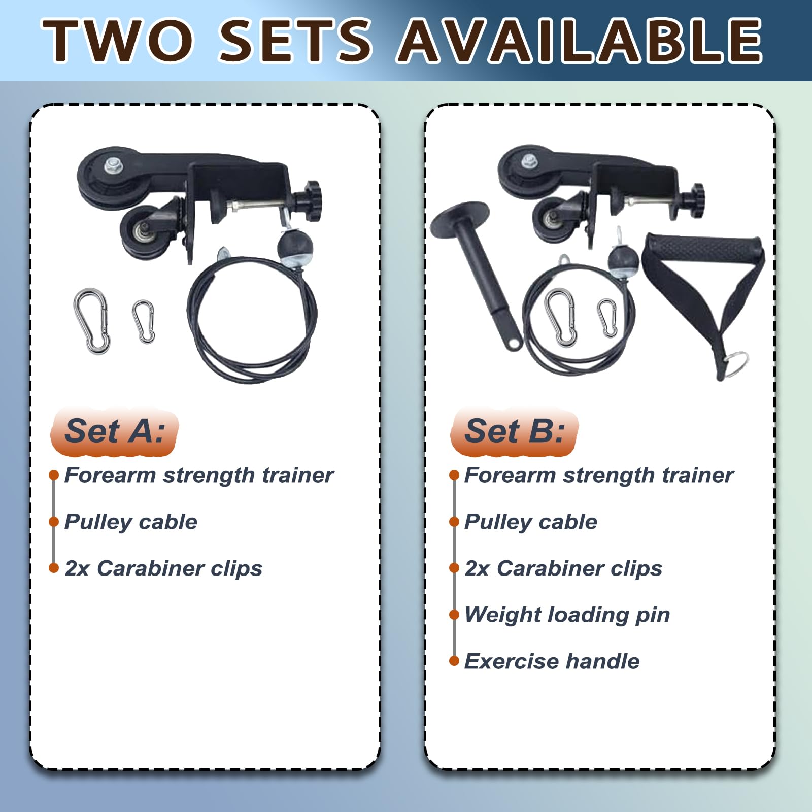 - Package includes forearm strengthener, weight loading pin, pulley cable, an exercise handle and two M8 carabiner clips