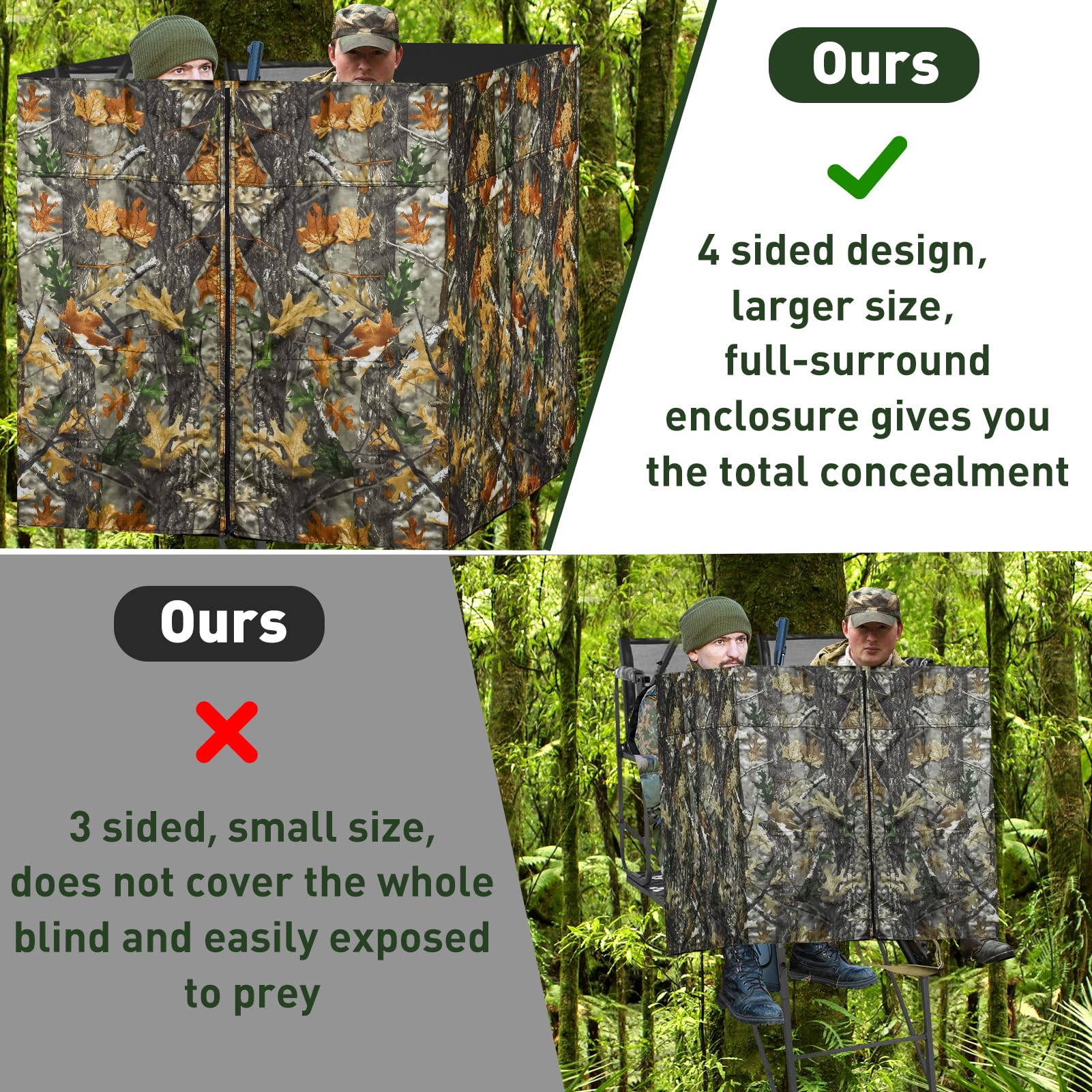 - Large size four-sided hunting blind: The size of the elevated deer blind is 142 x 35 IN/360 x 90 CM, the space is large enough for two people; It is equipped with a camouflage drawstring storage bag for easy storage and carrying (Tree stand is not included)