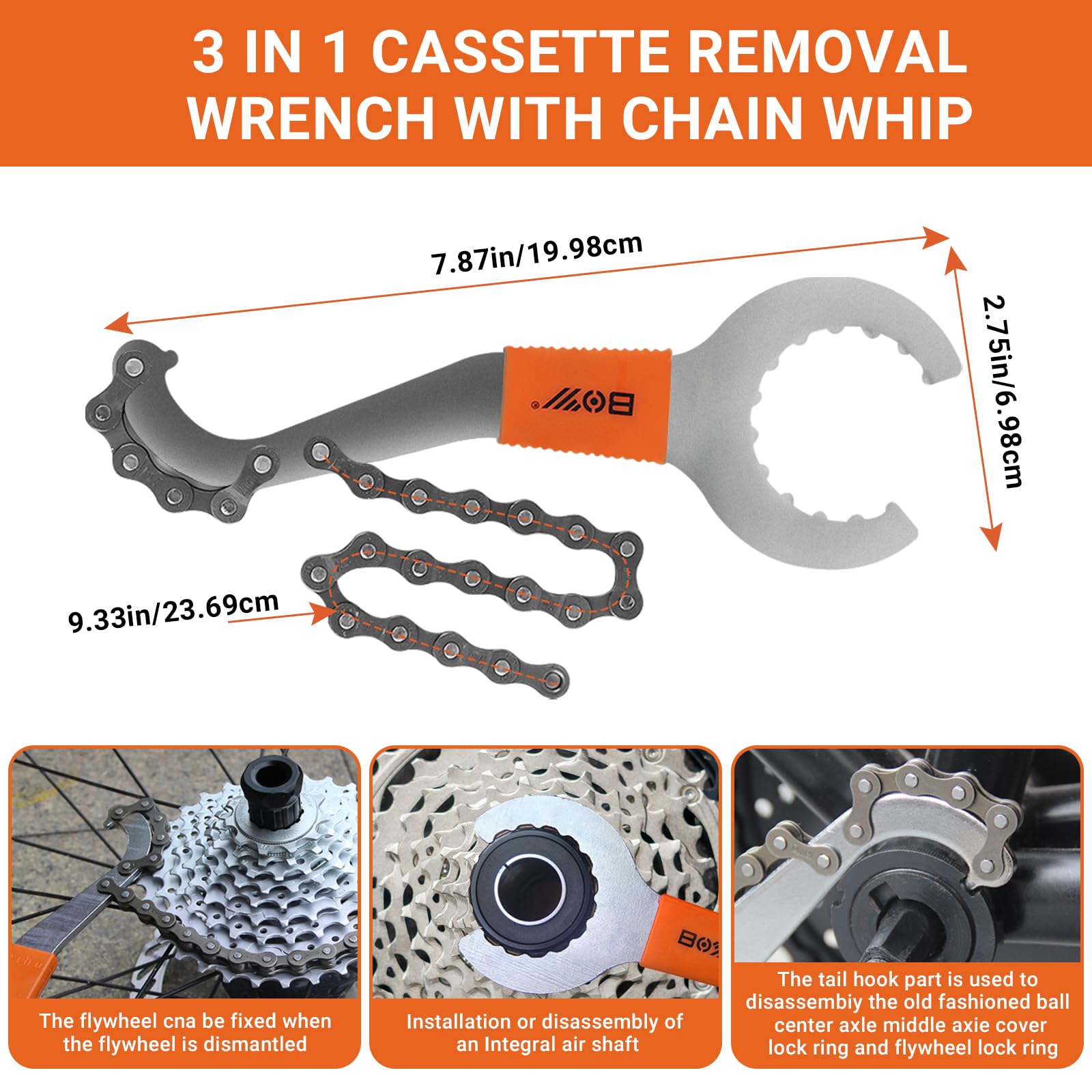 - 【Cassette Remover Wrench】3 in 1 cassette removal wrench with chain whip, it can be used to fix the dental plate of the bicycle, install and remove the bottom bracket and cassette of the bicycle or replacement Hubs. Multiple ways to used, one tool can replace 3 independent tools, save your toolbox space, more convenient to carry.