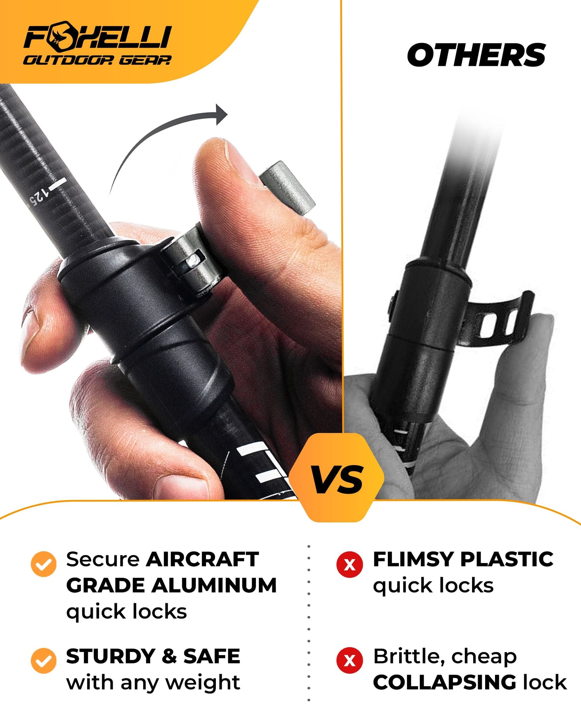 - MOVE FASTER & FURTHER WITH LESS EFFORT: Foxelli hiking poles are made from Ultralight Aluminum 7075 material. Weighs only 9.4 oz so it reduces arm fatigue allowing one to move quicker and go the extra mile while exerting less energy. Indestructible design will withstand the most challenging backpacking trips.