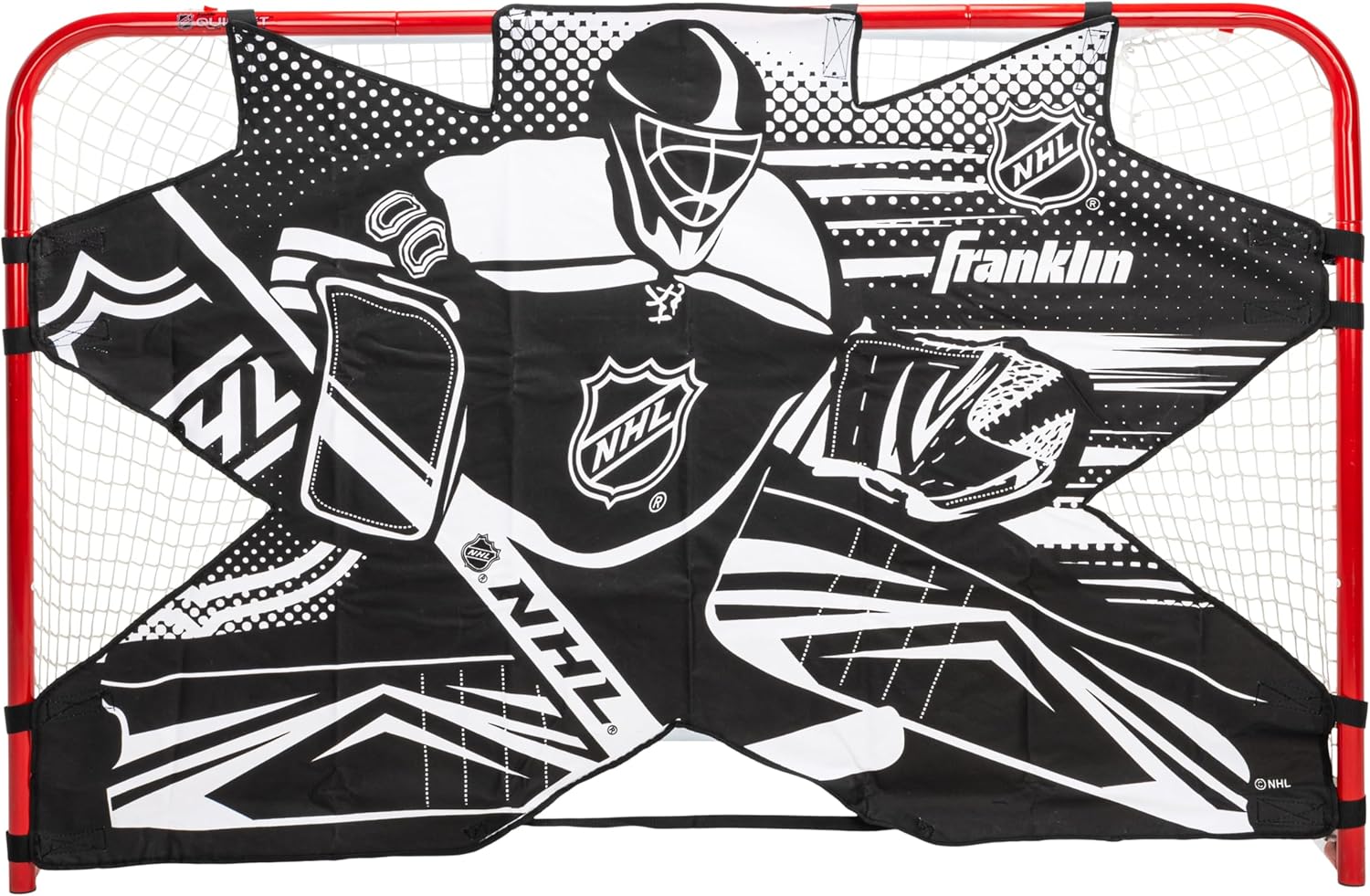 Pick your spot and hit your shots with the Franklin Sports NHL Street Hockey Goalie Shooting Target! This easy-attach shooter tutor is the perfect piece of hockey training equipment to help youth and adult hockey players practice their shooting accuracy and improve their scoring skills. This detachable shooting target can be easily applied to street hockey goals to turn your net into your own personal competition. Simply attach the self-stick straps to the goalposts to get started. Hit the scoring zones to beat the goaltender and improve your shooting skills! Available in both official size (72" x 48") and junior size (54" x 44") we have the perfect shooter tutor for your outdoor hockey net. These targets are constructed with extra heavy weight 600D waterproof construction to withstand the force of your shots and the elements for multiple seasons of practice and games. These shooting targets are designed only for play with 2 5/8" hockey balls only. So if you're ready to improve your hockey game and become a precision goal scorer, grab yourself a Franklin Sports NHL Street Hockey Goalie Shooting Target and start shooting today!