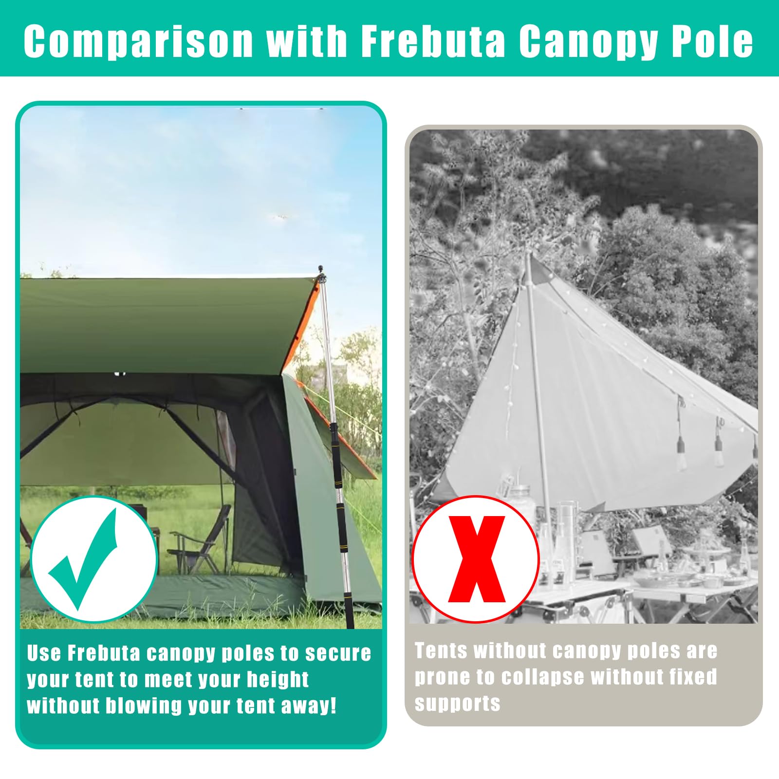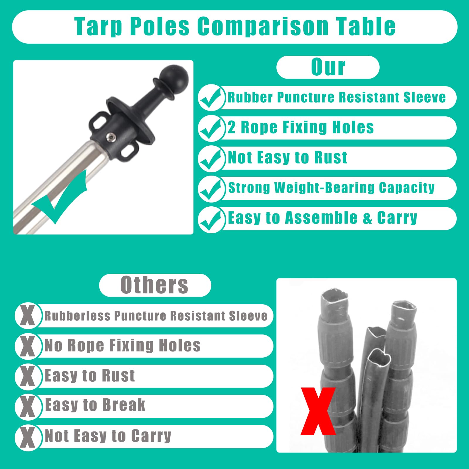 - 【Non-Slip & Piercing Resistant】Camping tent support poles with rubber protectors at the top are not easy to puncture and damage the tent, stainless steel threaded pegs containing non-slip grooves to enhance the windproof performance, preventing the tent from slipping in the wind and firmly stabilising your tent. Shade cloth poles heavy duty are designed with 2 small ear openings at the top, you can directly attach the tarpaulin ropes to canopy poles outdoor to enhance the stability of the tent