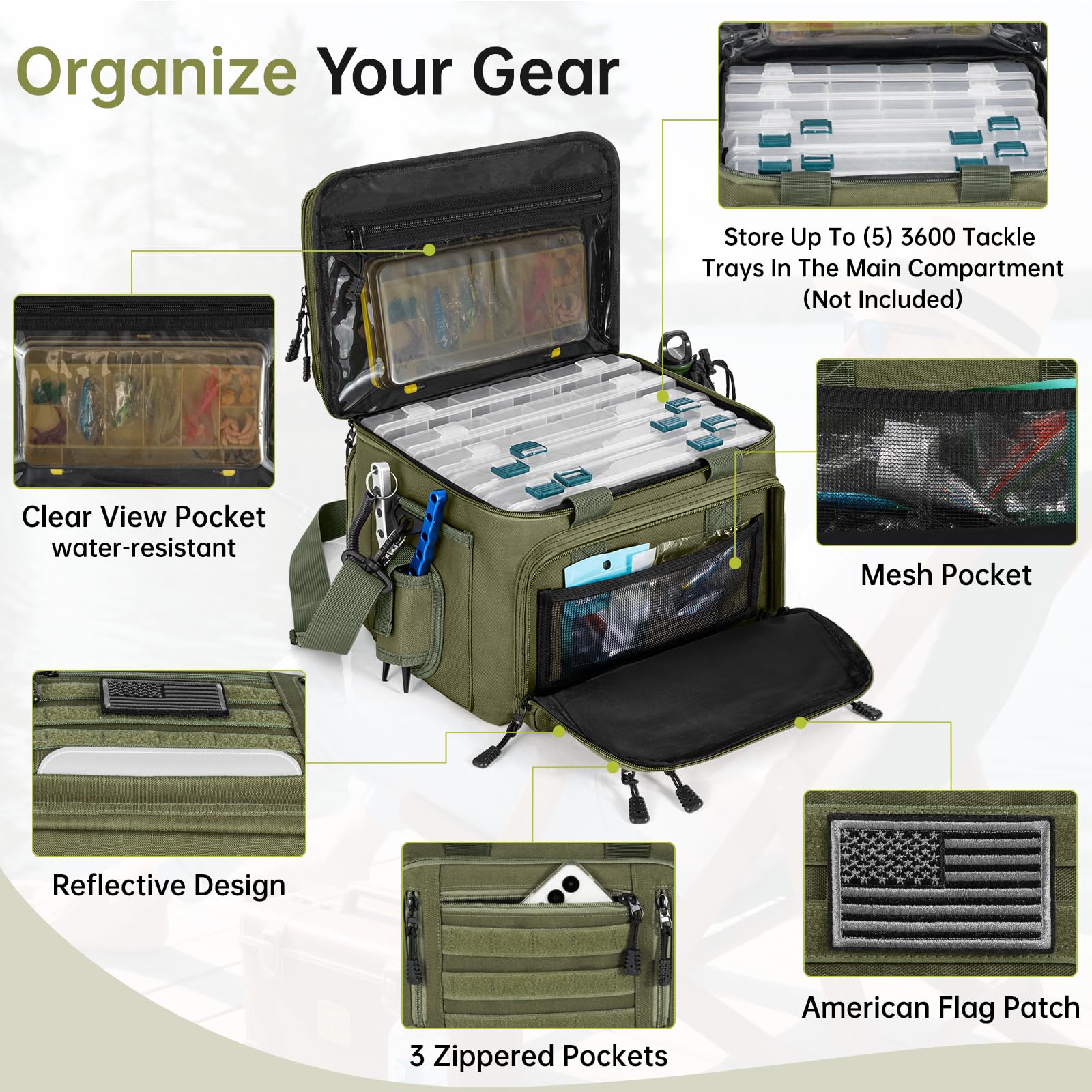 - 【Large Capacity】:The fishing tackle bag main compartment with double zipper opening is spacious and can accommodate 5 tackle boxes (3600), and the upper compartment can accommodate 1 tackle box (3600), providing you with enough space to store bait. NOTE: This tackle bag does not come with a box