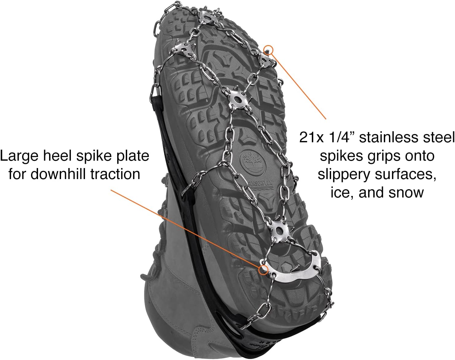 - DOWNHILL ANTI-SLIP TRACTION: 21 stainless steel 7mm spikes are dispersed from heel to toe making for even weight distribution and stability trekking through icy conditions, snow, and mud. Large spike plate at the heel provides premiere all-purpose traction for downhill slopes.