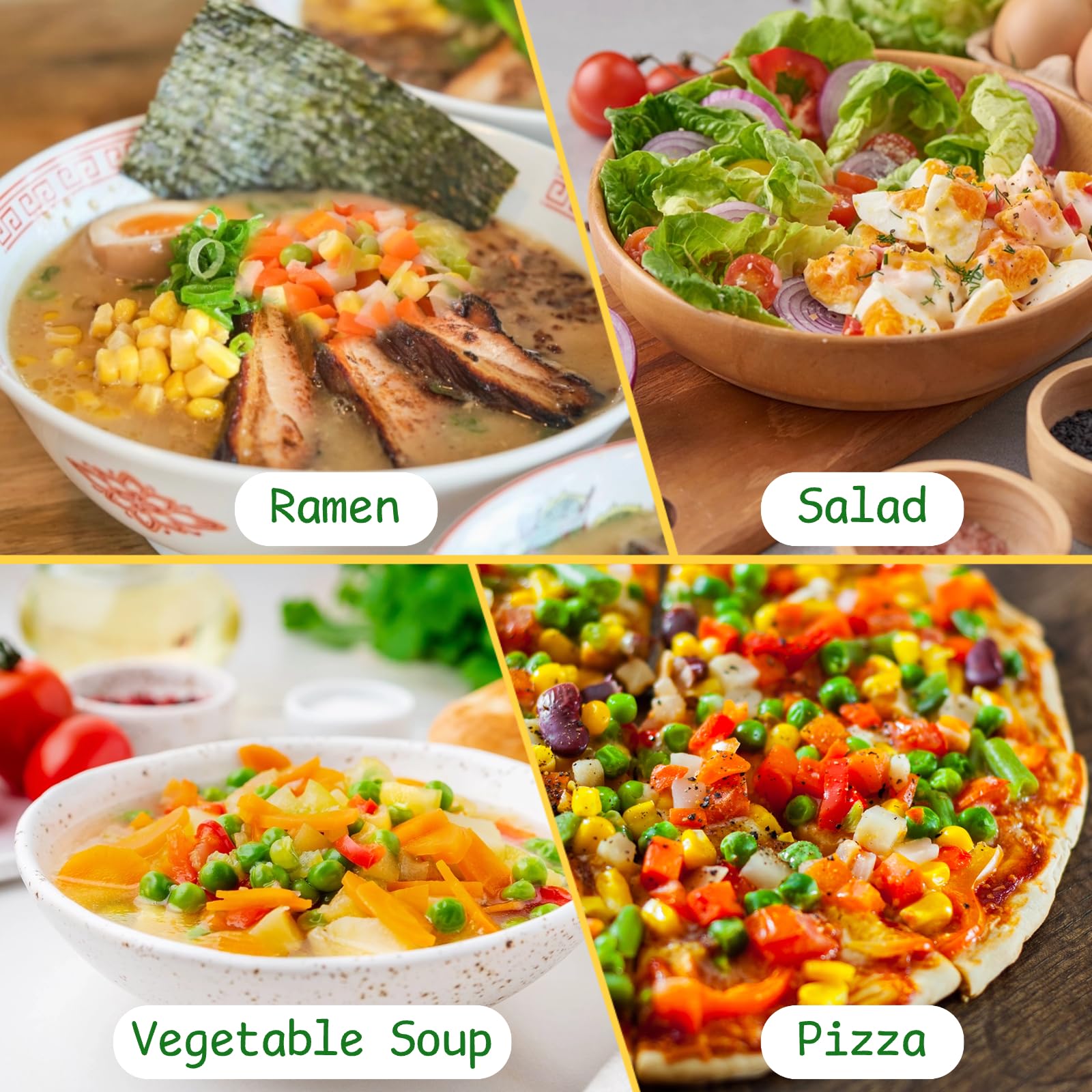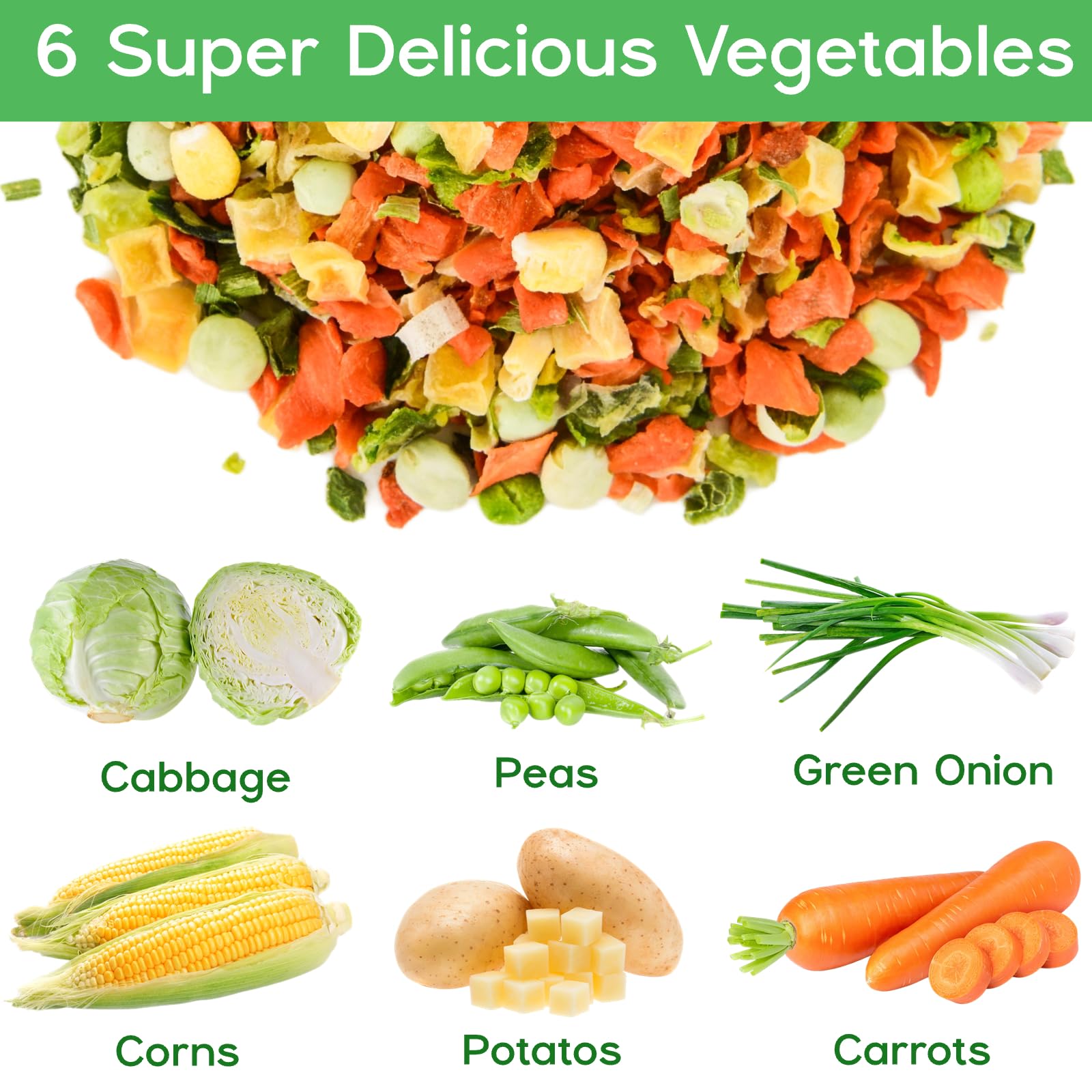 - Rich Dehydrated Vegetables: Indulge in our high-quality vegetable mix, featuring a delightful combination of Peas, Corn, Carrots, Cabbage, potatoes, Green Onions. A great addition to ramen noodles while adding color and nutrition to your vegetable soups, stews and vegetarian pizzas