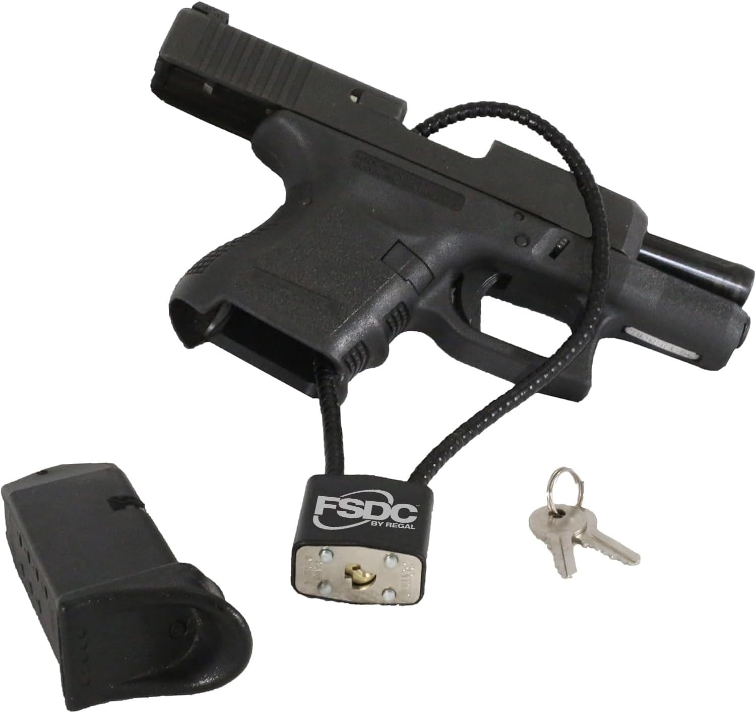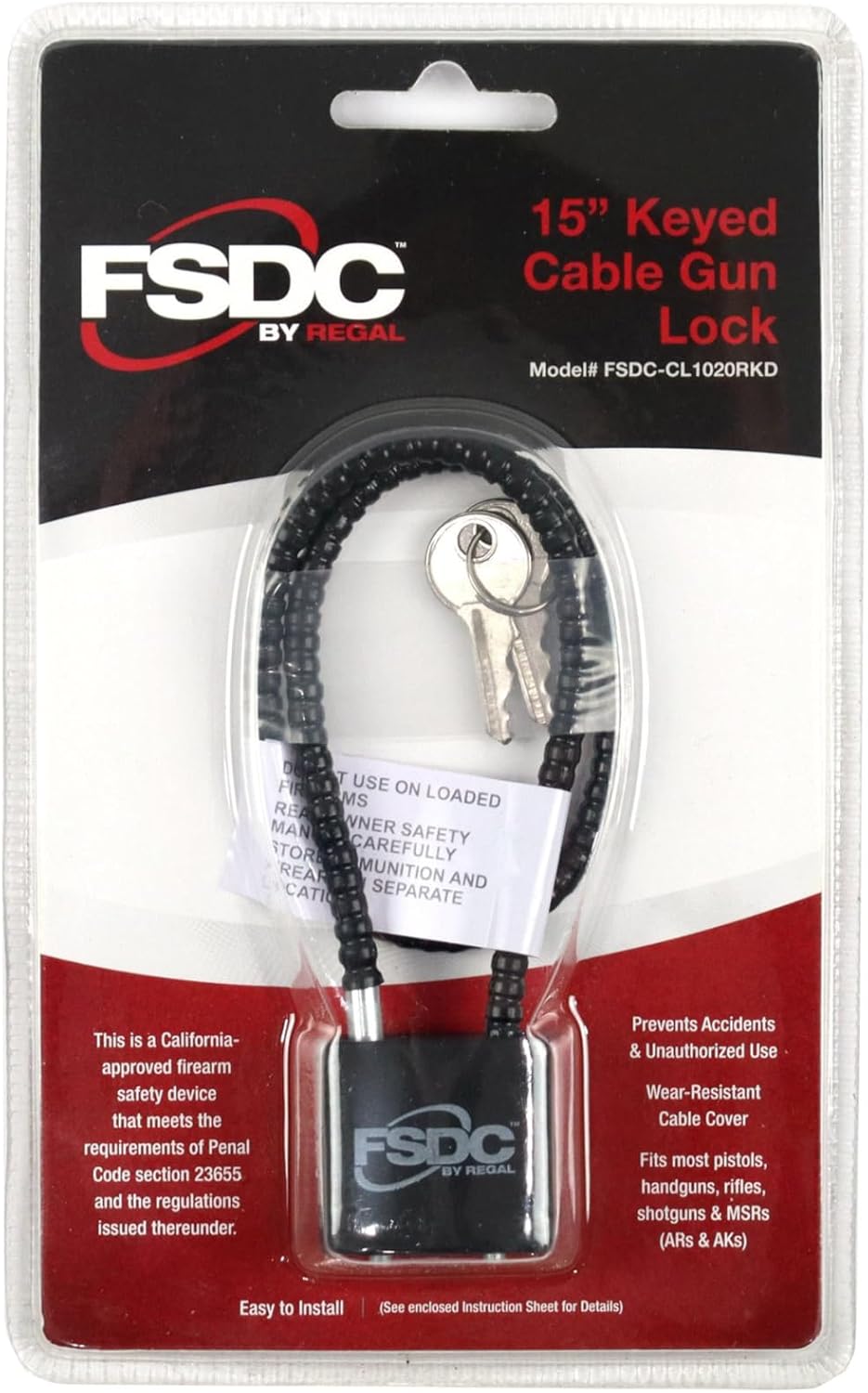 FSDC-CL1020RKD 15" Firearm Safety Cable Gun Lock. Useful for pistols, handguns, rifles, shotguns,Modern Sporting Rifles, BBguns, paintball, pellet and airsoft guns. Black cable cover and body with FSDC logo on both sides. Package includes two keys and an English/Spanish/French instruction sheet. This lock is a California-approved firearm safety device that meets the requirements of Penal Code section 23655 and the regulations issued thereunder. This lock has been approved by the Colonel of the Massachusetts Department of State Police in accordance with the provisions of M.G.L. c. 140, § 131K