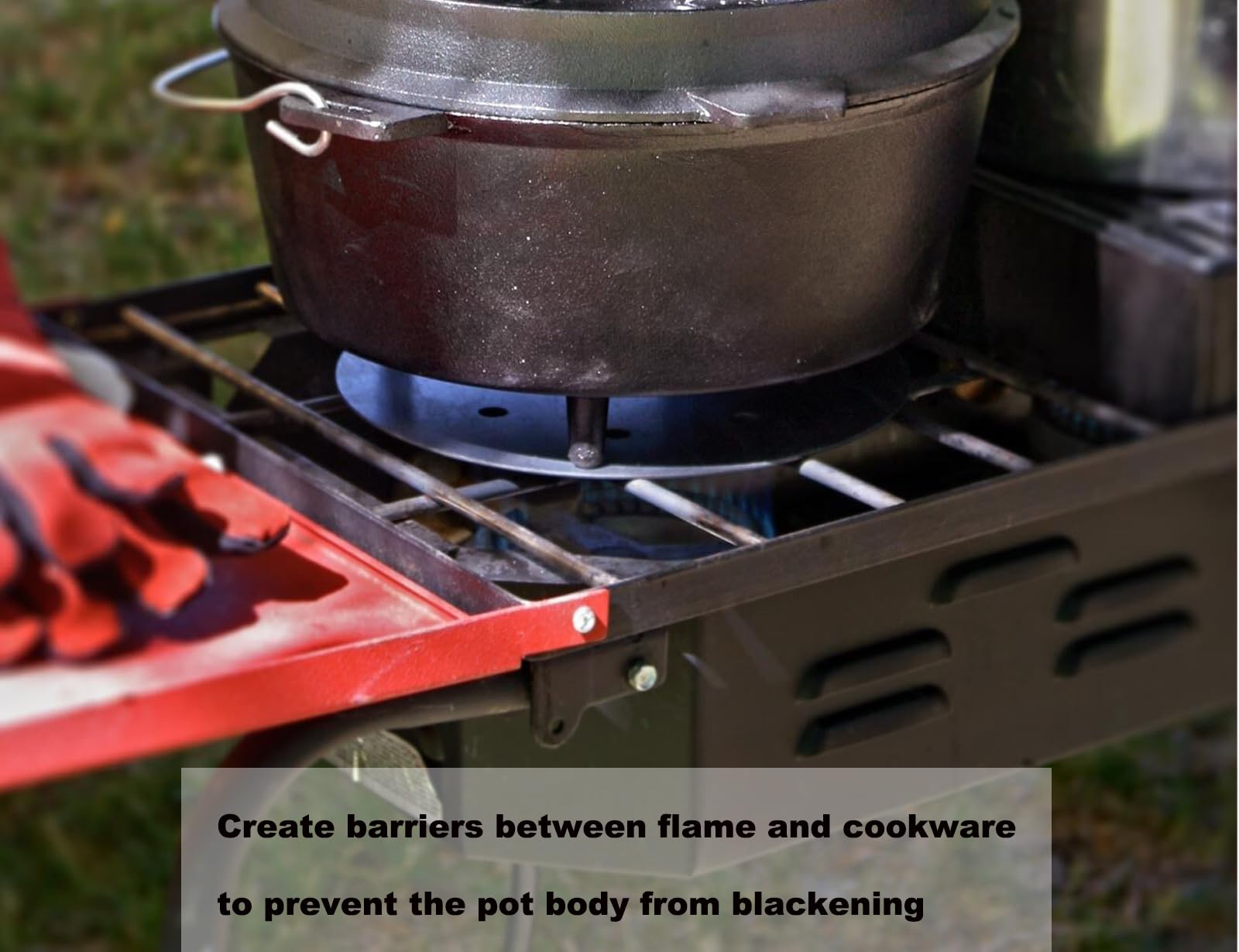 - 【Protect Pot Cookware】 Camp chef flame tamer heat diffuser disperse heat and to create barriers between flame and cookware, heat diffuser helps to eliminate the sizzling sound and hot spots, camp chef dutch oven dome and heat diffuser plate can keep the pot body away from blackening. When camping, with heat diffuser for camp chef outdoor gas stove, it will reduce burning pots and dirty stove, you do not worry about the bottom of the pot dirty car, make your camp easy.