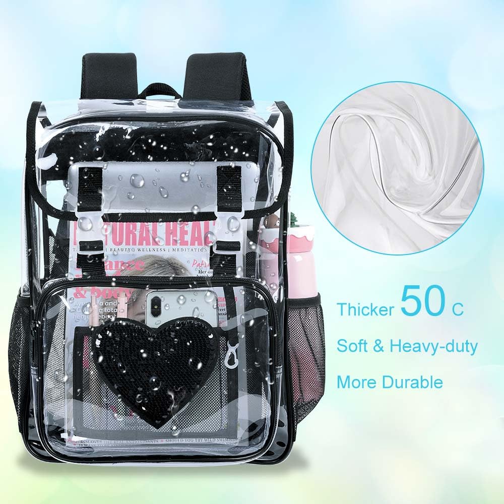 - Heavy Duty Clear Backpack: Transparent backpack with durable thickened PVC, easy to clean, not stiff in winter. Reinforced shoulder straps and bottom stitching to improve tear resistance.