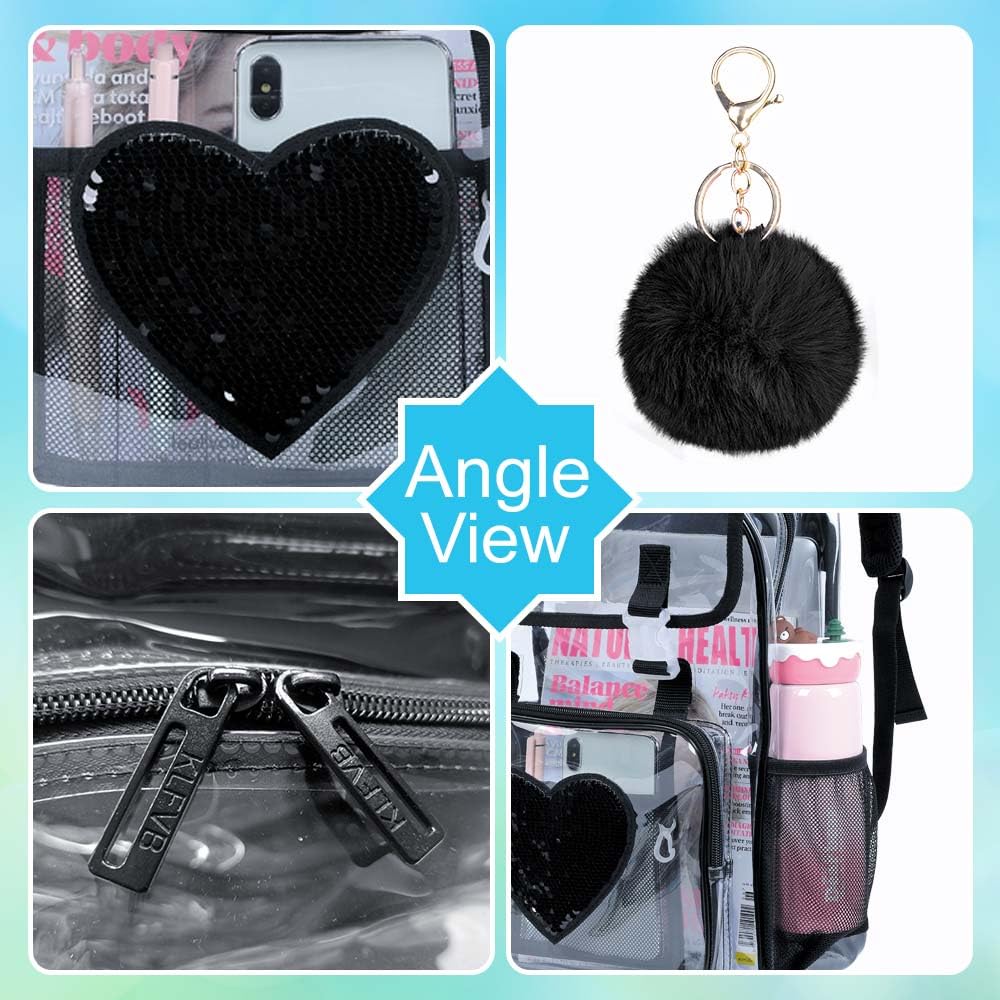- Unique style: Stylish flap design, the clear backpack for girls embellished with reversible purple heart sequins, complete with two compartments and two side pockets for store standard folders.