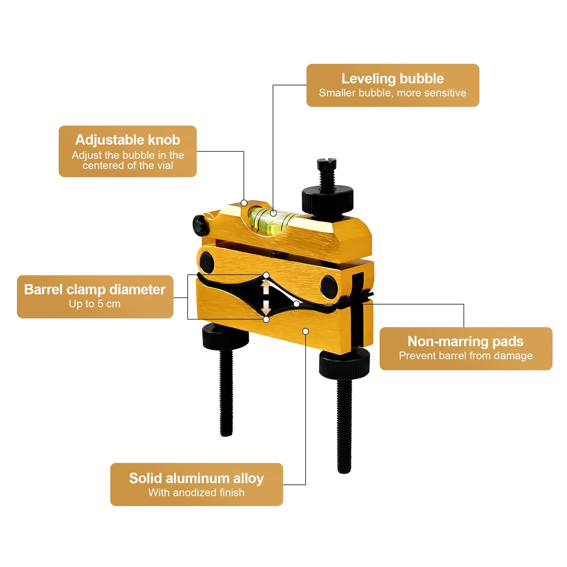 - Non-destructive: The barrel clamp level has a non-wear pad to ensure no damage at the point of contact