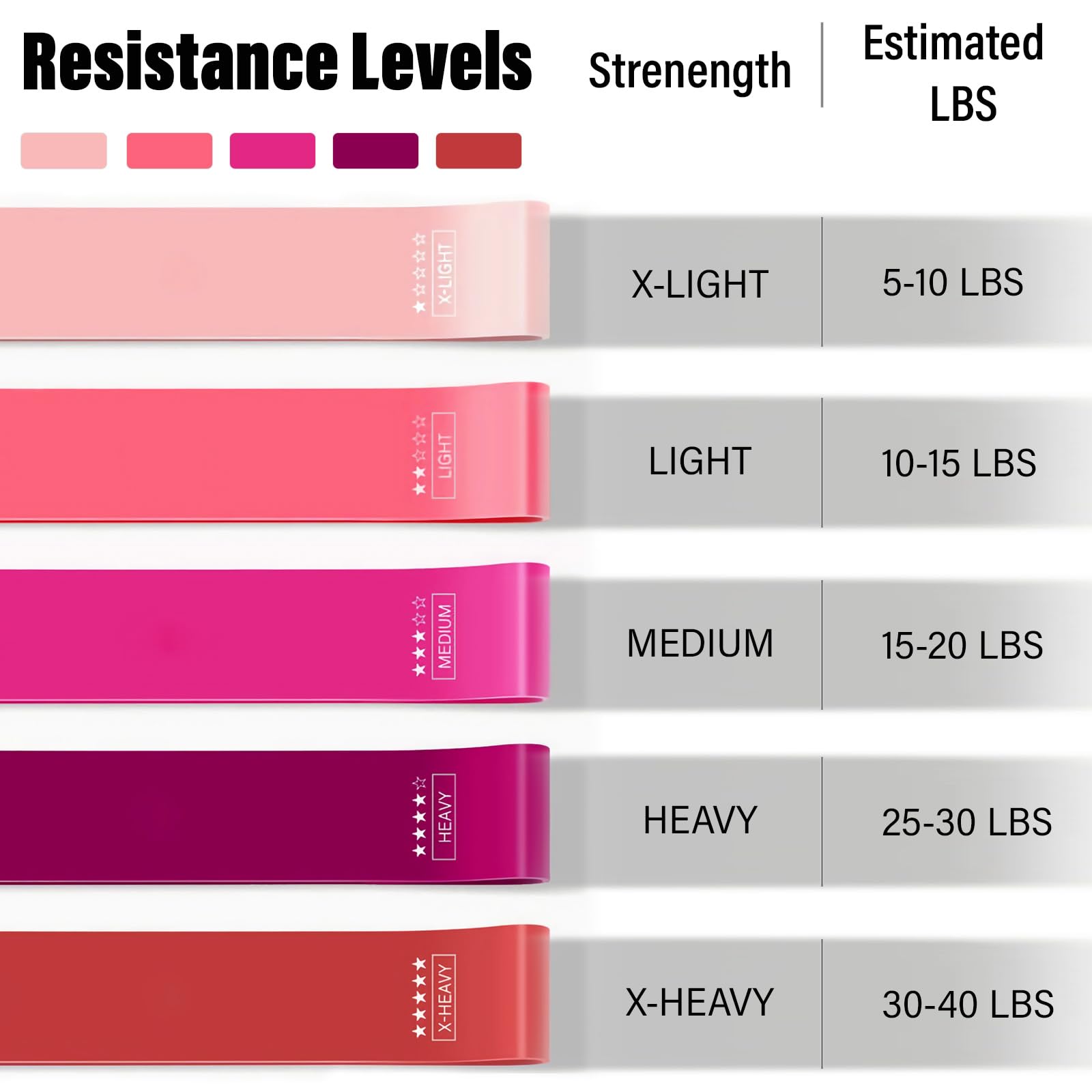 Resistance Level: X- Light(5~10lbs), Light(10~15lbs), Medium(15~20lb), Heavy(20~30lbs), Heavy(30~40lbs).