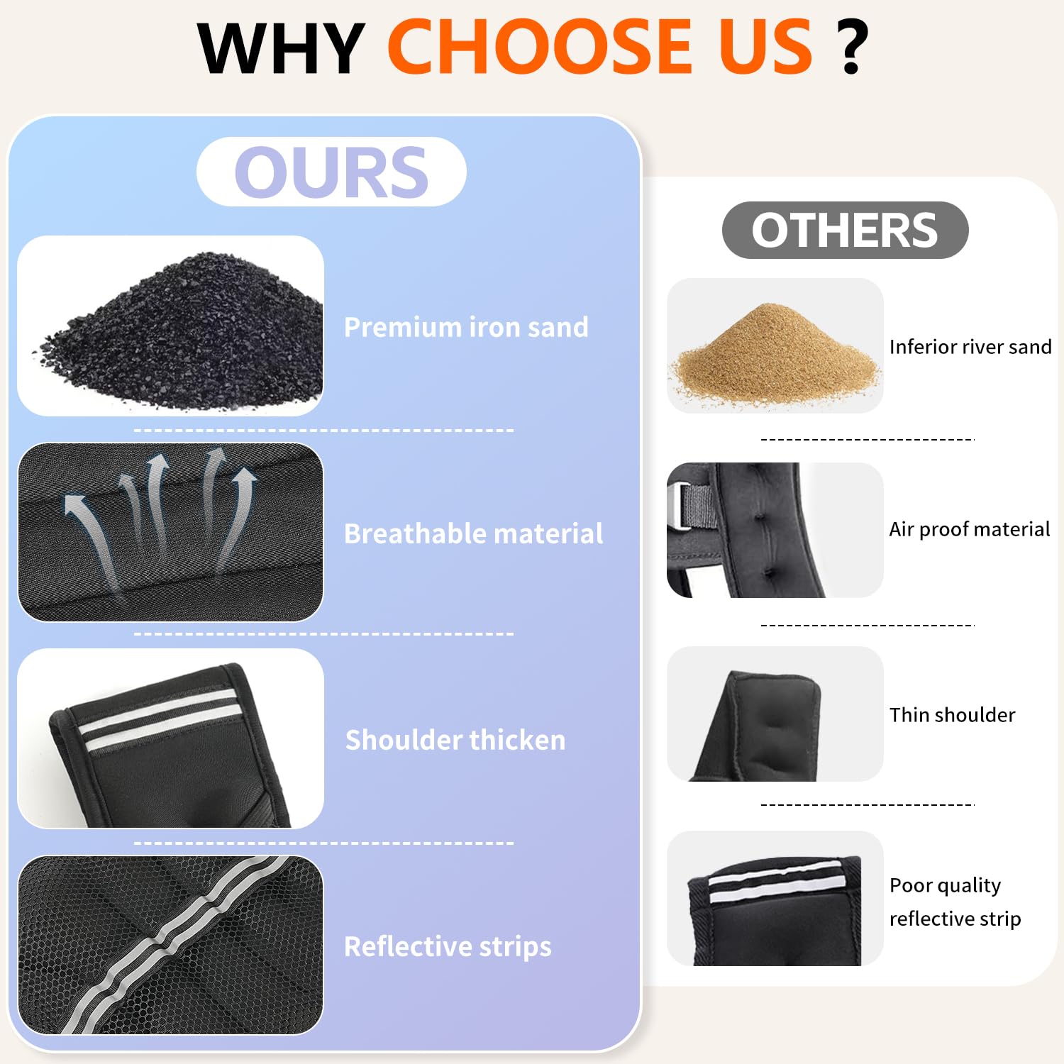 - BALANCED WEIGHT DISTRIBUTION: The weighted vest is filled with iron sand, providing even weight distribution for a comfortable and effective workout experience. Available in 5lb, 10lb, 12lb, 15lb, 20lb, 25lb, and 30lb options to suit your training needs.