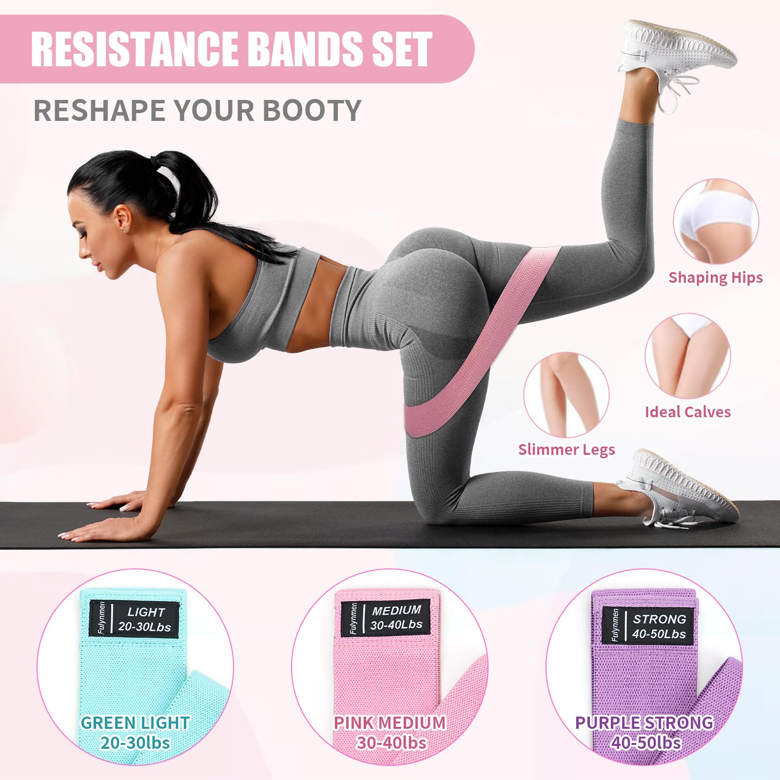 - 3 Level Resistance Bands: Fulynmen work out bands set with 3 different levels resistance Light (20-30lbs), Medium(30-40lbs), Strong(40-50lbs), perfect blend of cotton and latex ensures our booty bands will not slip down, roll or pinch your bare legs as you workout. Enjoy the comfortable Resistance bands for legs body shape whatever you are wearing.