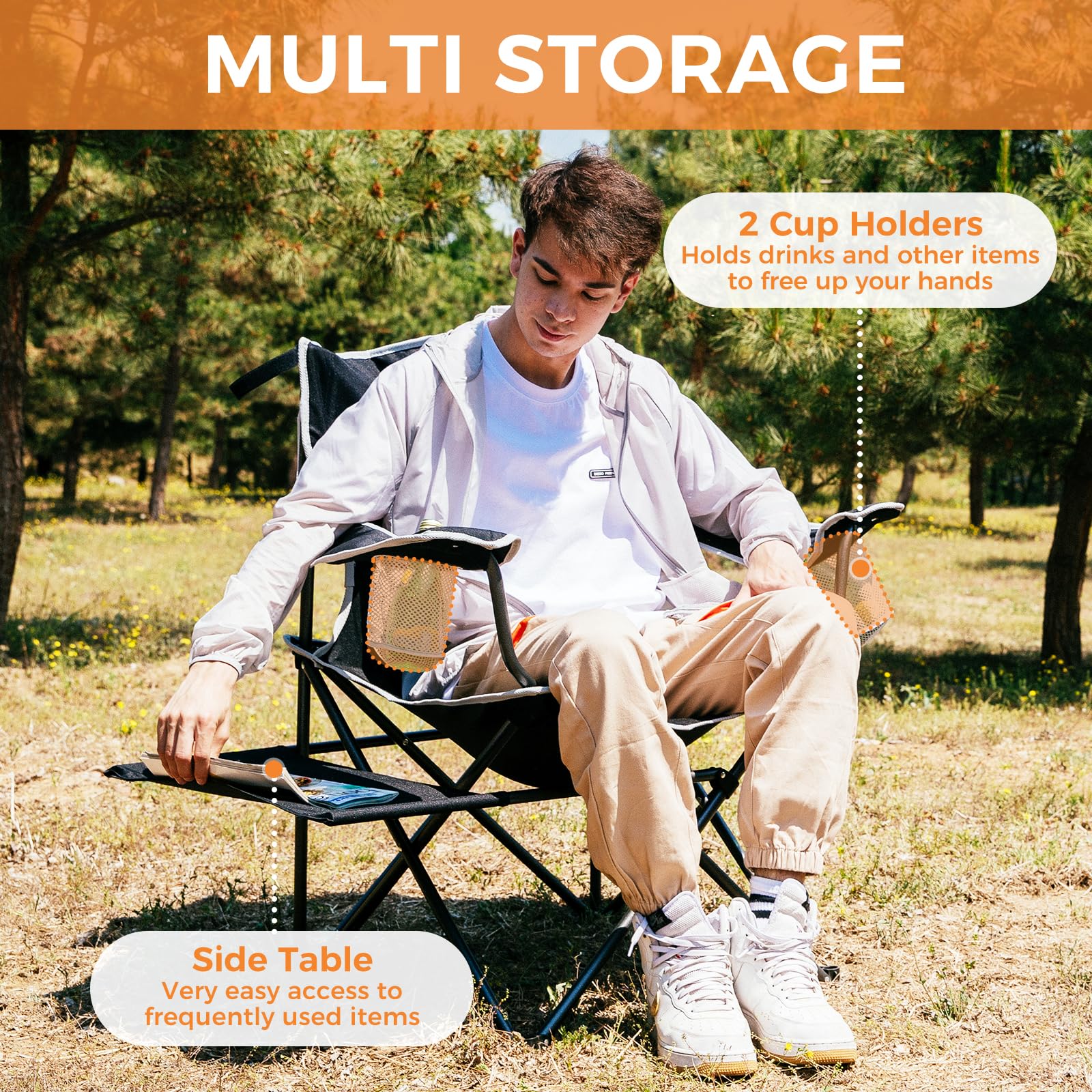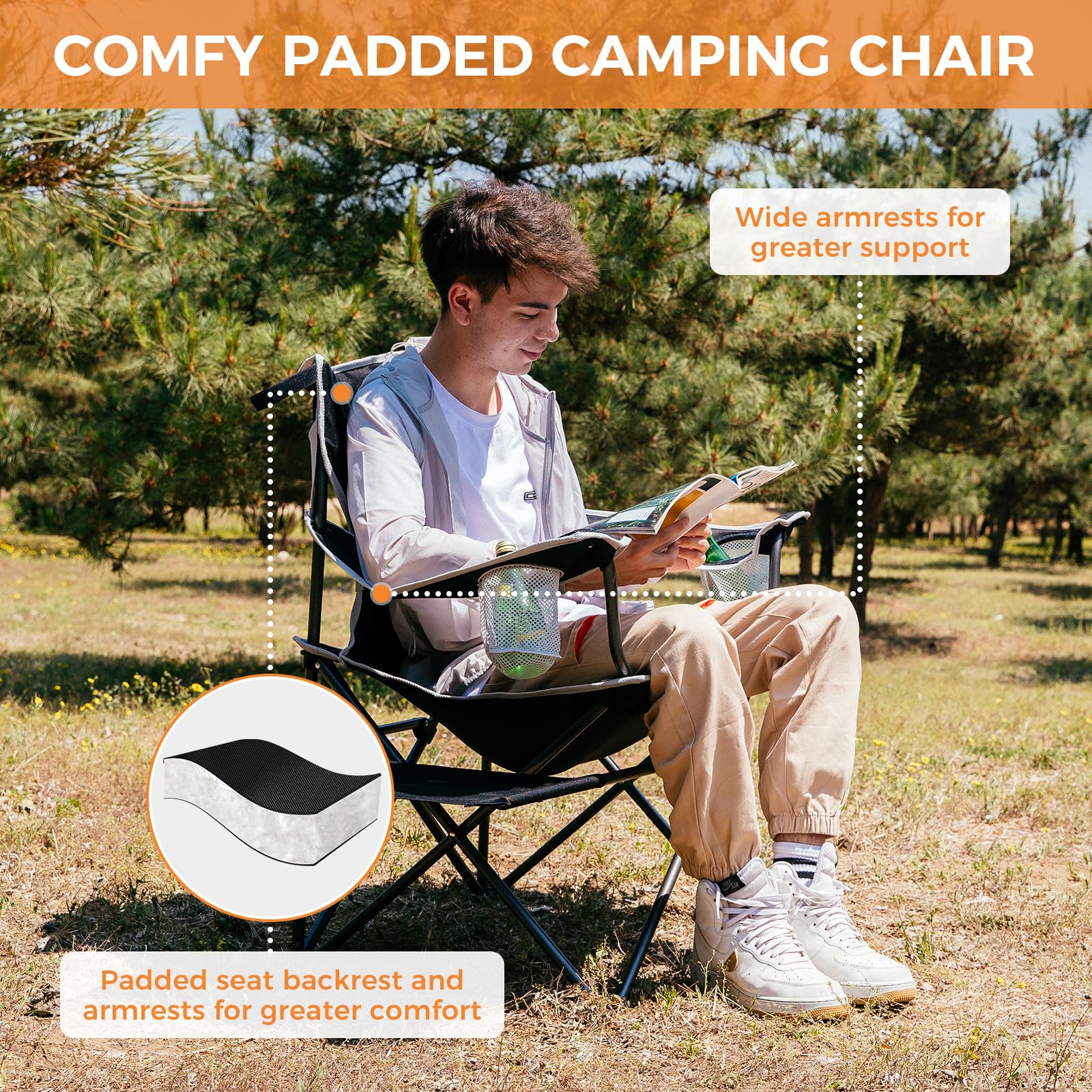 - 【Enhanced Comfort】The ergonomic design of the folding camping chair offers maximum comfort, with an oversized chair design providing ample space, armrests that support your arms, and a cotton backrest that cushions your back. The large size of the chair is particularly suitable for larger individuals.