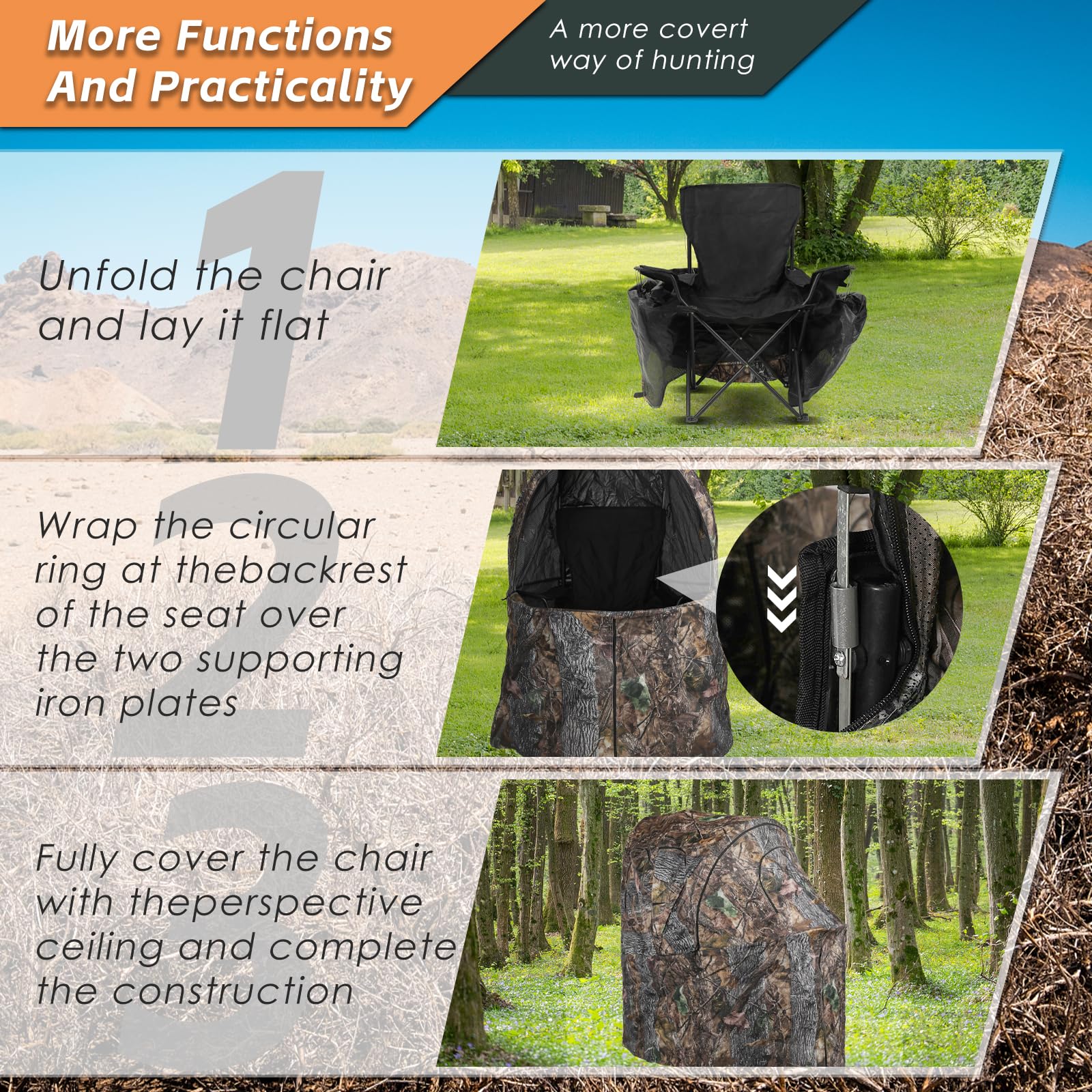 - ONE MINUTE TO BUILD: The hunting blind can comfortably accommodate 1 hunter. The hunting blind with attached bag can be easily carried to the hunting ground. Chair integrated design without a complex procedure, enables you to easily set up and folded back