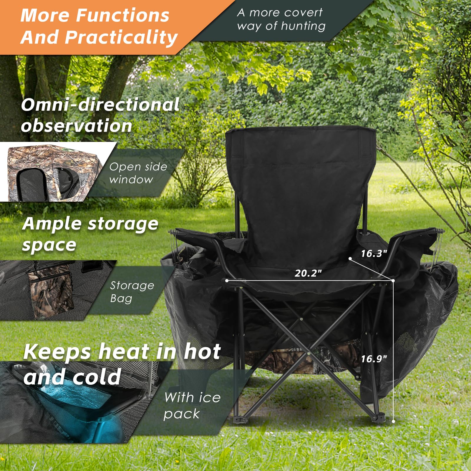 - INTEGRATED CHAIR AND INSULATION BAG: After FUNHORUN chair blind is unfolded, it includes a comfortable hunting seat, which is very convenient and lightweight. The hunting blind is equipped with insulation bags, which can store chilled drinks in the hot summer and be used to keep food warm in the winter