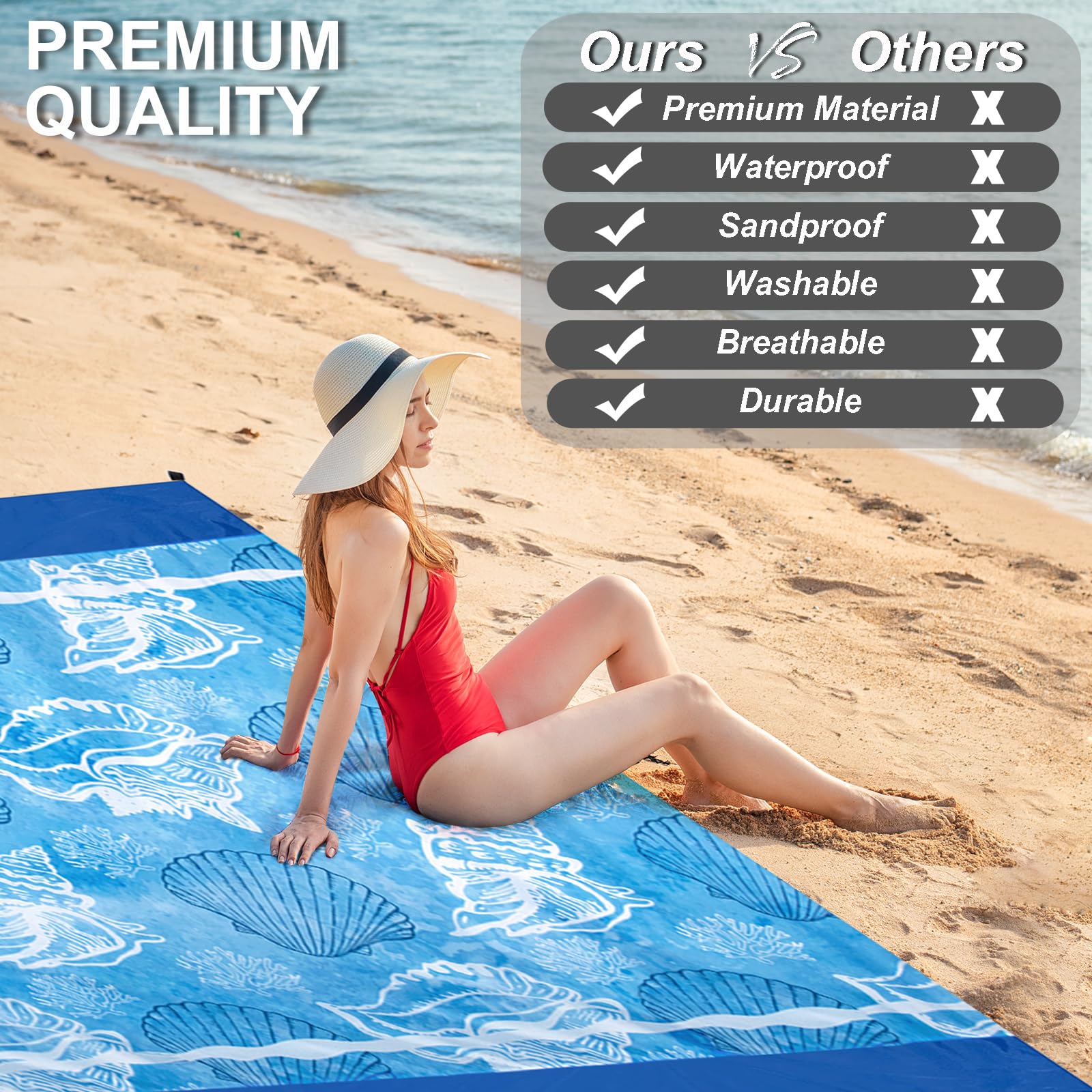 - Sandproof and Waterproof: This extra large beach blanket is an essential beach accessory or equipment for beach vacations! Dry sand can be easily removed by shaking, and it will not stick to the sand-proof beach blanket or picnic blanket. For wet sand, just spray water on it. Made of quick-drying material, our beach blanket is effectively waterproof and dries quickly. It is a great outdoor sand-proof beach blanket that allows you to enjoy worry-free outdoor fun.