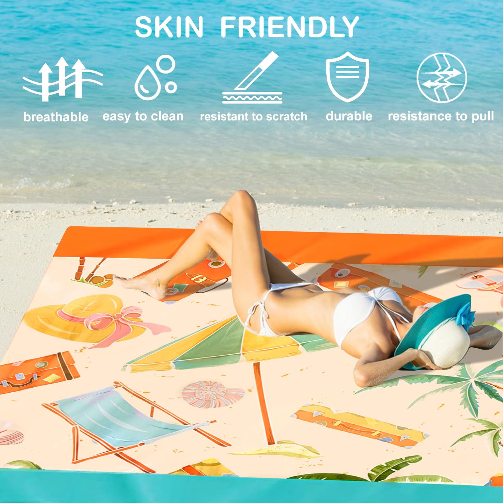 - Comfortable & Windproof: Made of tear-resistant polyester, it is skin-friendly and sandless. The sand free beach blanket comes with 4 anchor stakes and 4 sand pockets to help fix your blanket on the beach. You don't have to worry about the beach sheet being disturbed by the wind and sand, and you can enjoy a more enjoyable day at the beach.