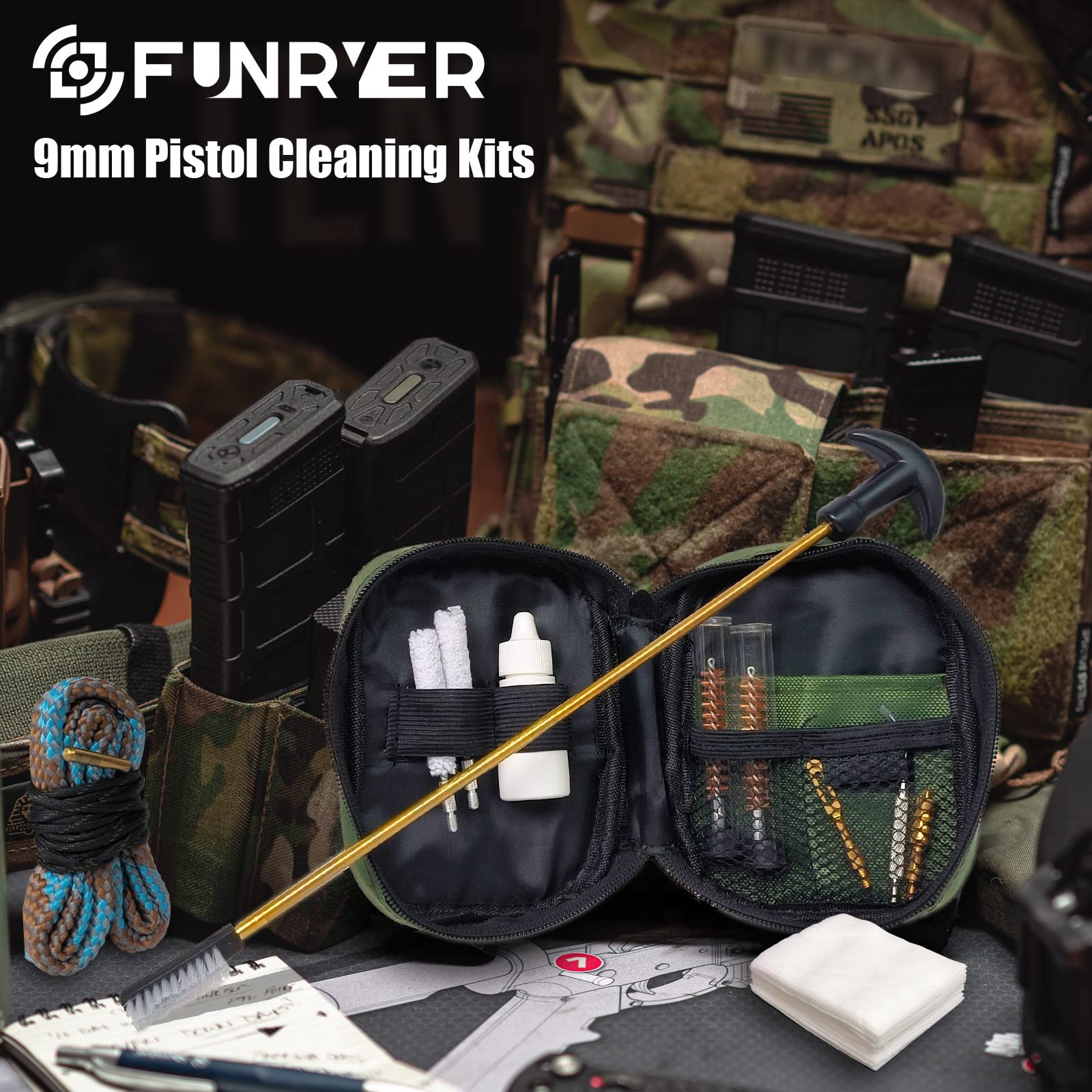- 【ALL-IN-ONE】Funryer 9mm Gun cleaning kit contains: 1x 9mm gun snake, 1x Brass Jag, 2x bronz brushes, 2x cotton mops, 1x brass slotted tip, 2x gun cleaning rods with handle, 1x gun cleaning brush, 50x gun cleaning patches, 1x cleaning pick, 1x oil botton(without oil).