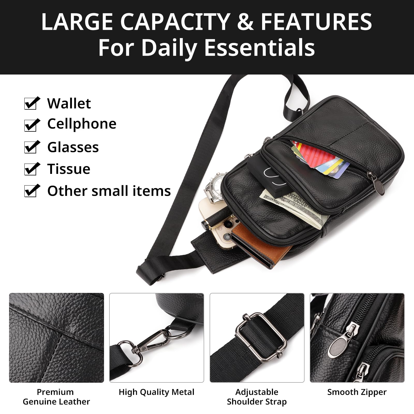 - Large Structure & Convenient. Our small leather backpack purse has 4 separate pockets, ideal to organize your essentials separately. Roomy enough for keys, earphones, phone, passport, power bank, sunglasses and small personal items, keeping them safe and well organized. It's very fashionable and is a versatile everyday chest bag for both women and men.