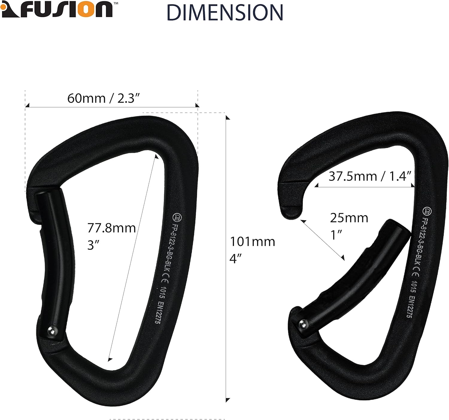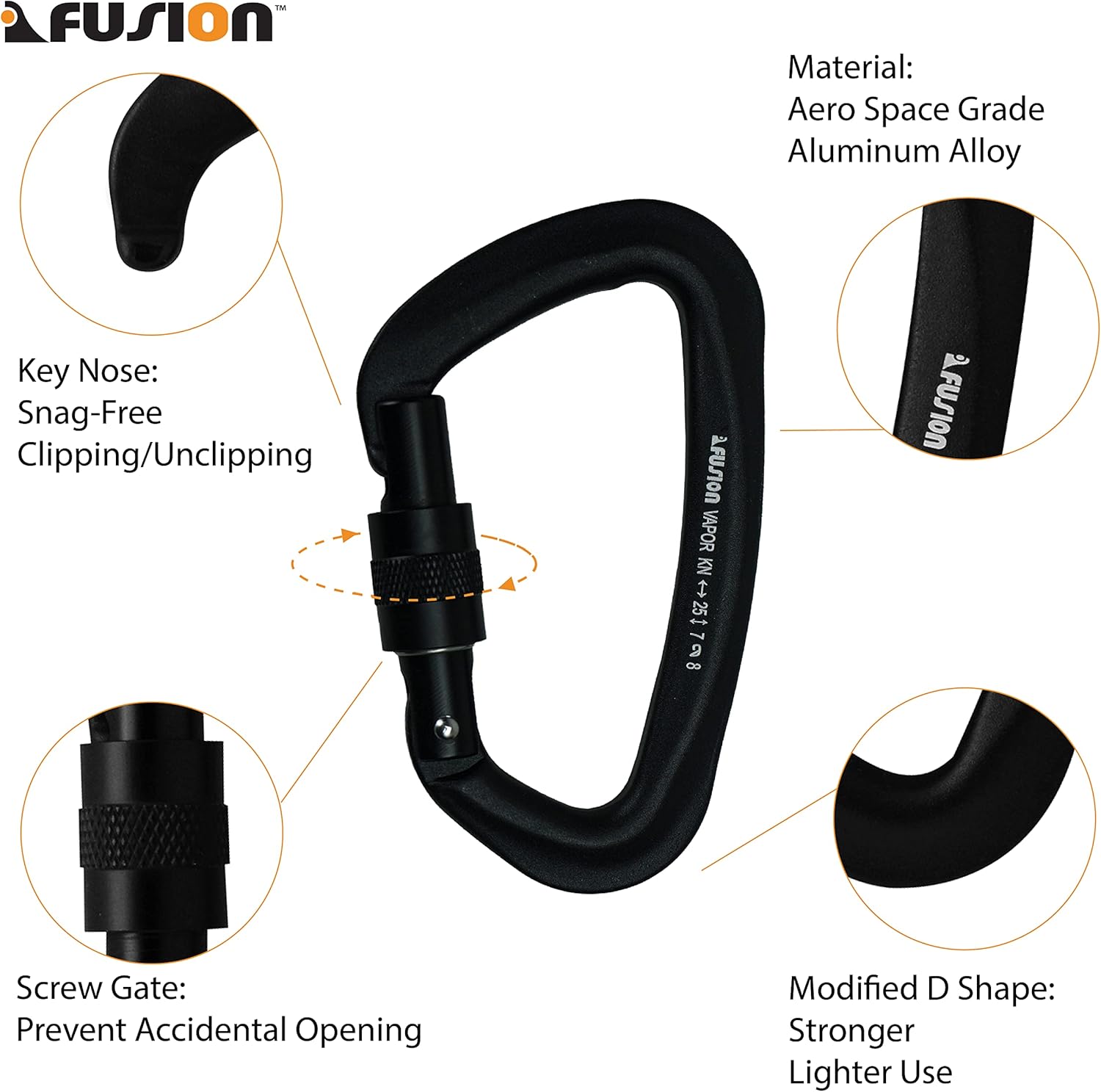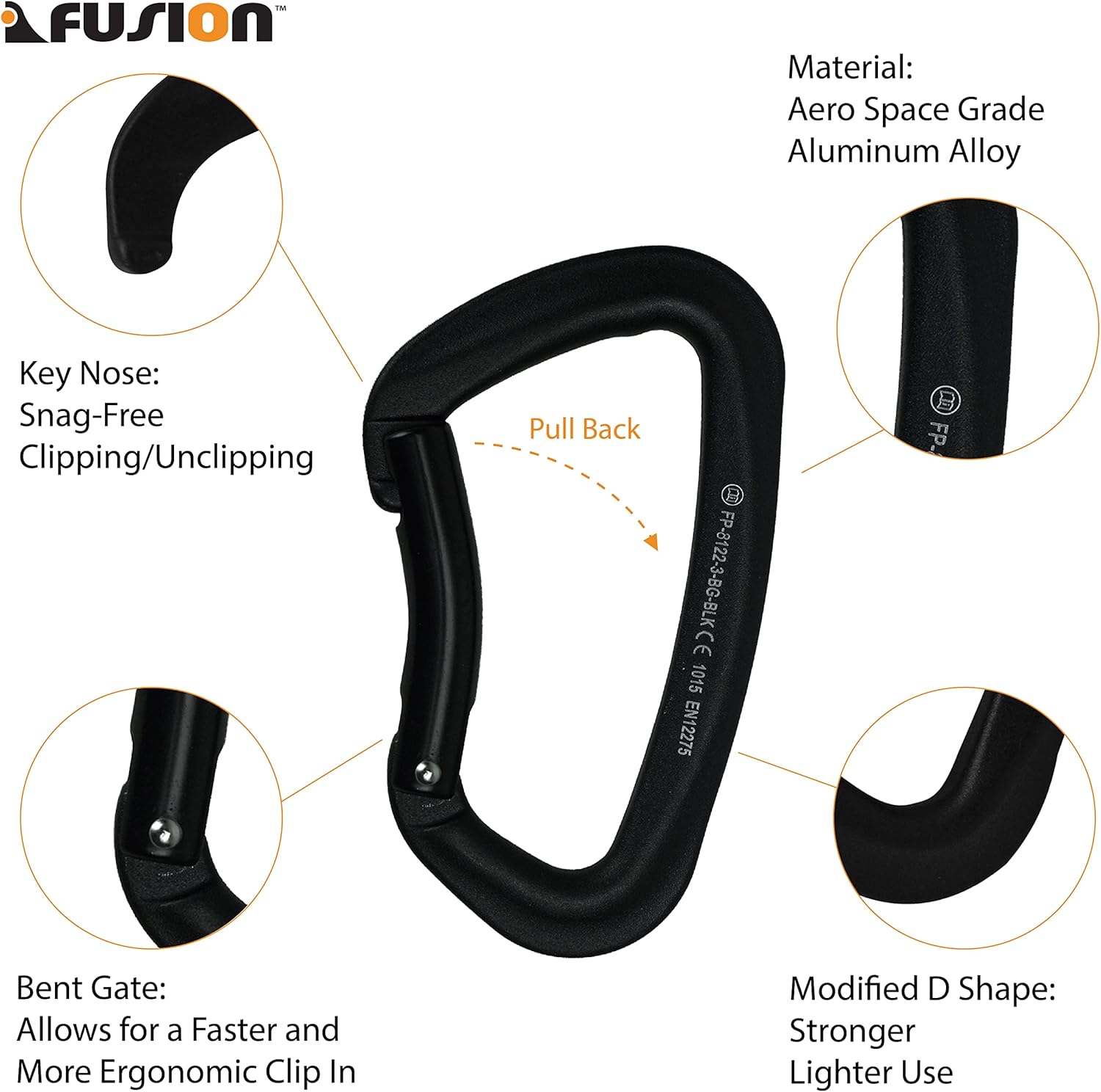 The Fusion Climb FP-8122-ST Vapor III Carabiner is popular among climbers, caver and mountain rescuers for providing most of the benefits without the weight and bulkiness. This carabiner features an aluminum body which is significantly lighter than steel and therefore far more popular in the outdoor climbing industries where weight is a major factor. Featuring a non-locking gate for general use and when clipping quickly is important. All non-locking carabiners are spring-loaded to ensure immediate gate closure upon release. This straight gate design is most commonly used, this straight gate tends to be stronger in nature then a bent gate design. This carabiner had a key nose, which does not have a notch like traditional pin nose designs. The advantage of having a key nose carabiner is that there is no notch to snag onto anything while clipping or unclipping. This carabiner displays a modified “D” shape which helps to push the load to the back of the spine. Allowing the weight to be carried primarily by the spine and less by the gate– making for a stronger and lighter use. Rated Strength of 26 kN.