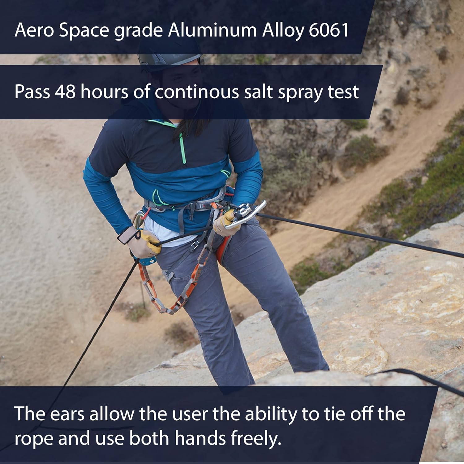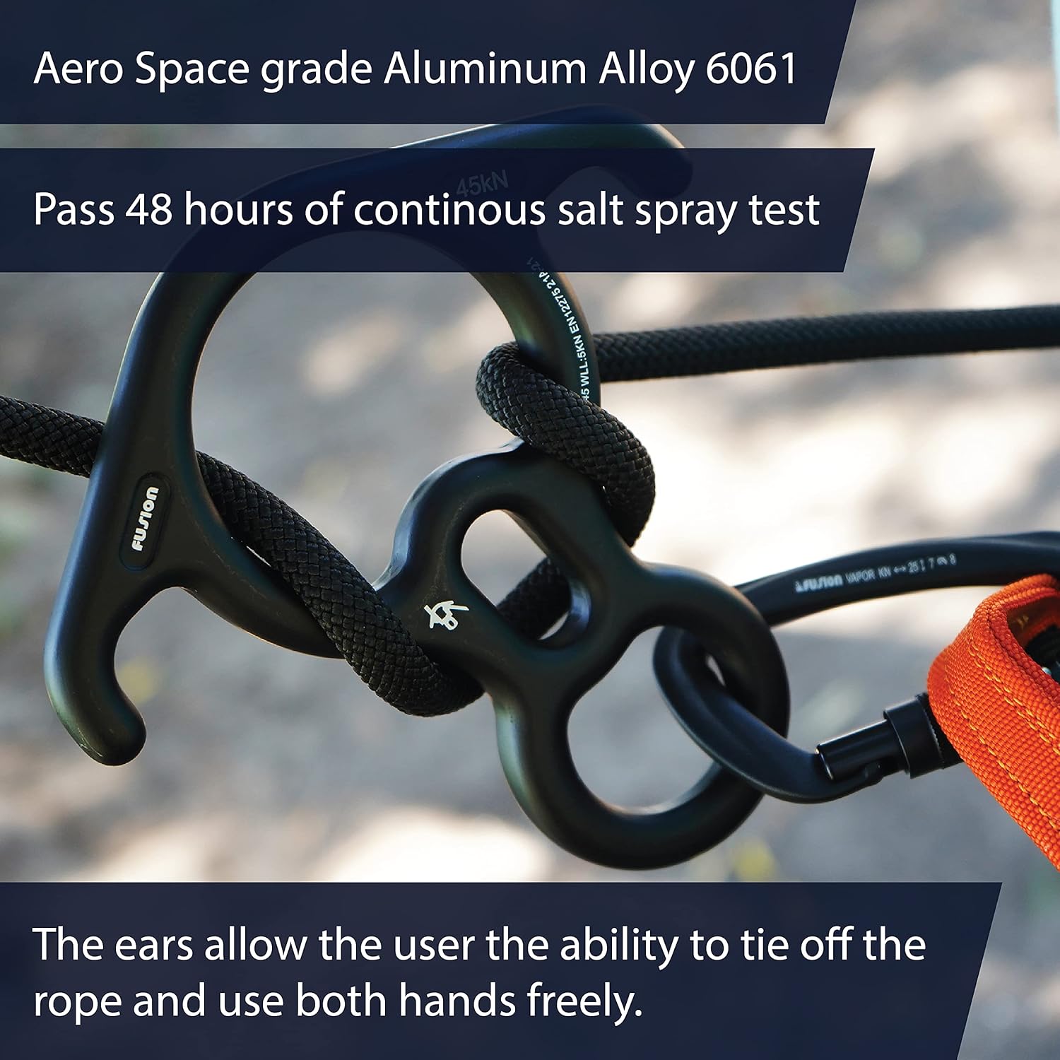- Feature: The bent ears seen on either side of the descender allows the user the ability to tie off the rope and use both hands freely. While still maintaining a safe and easy use.