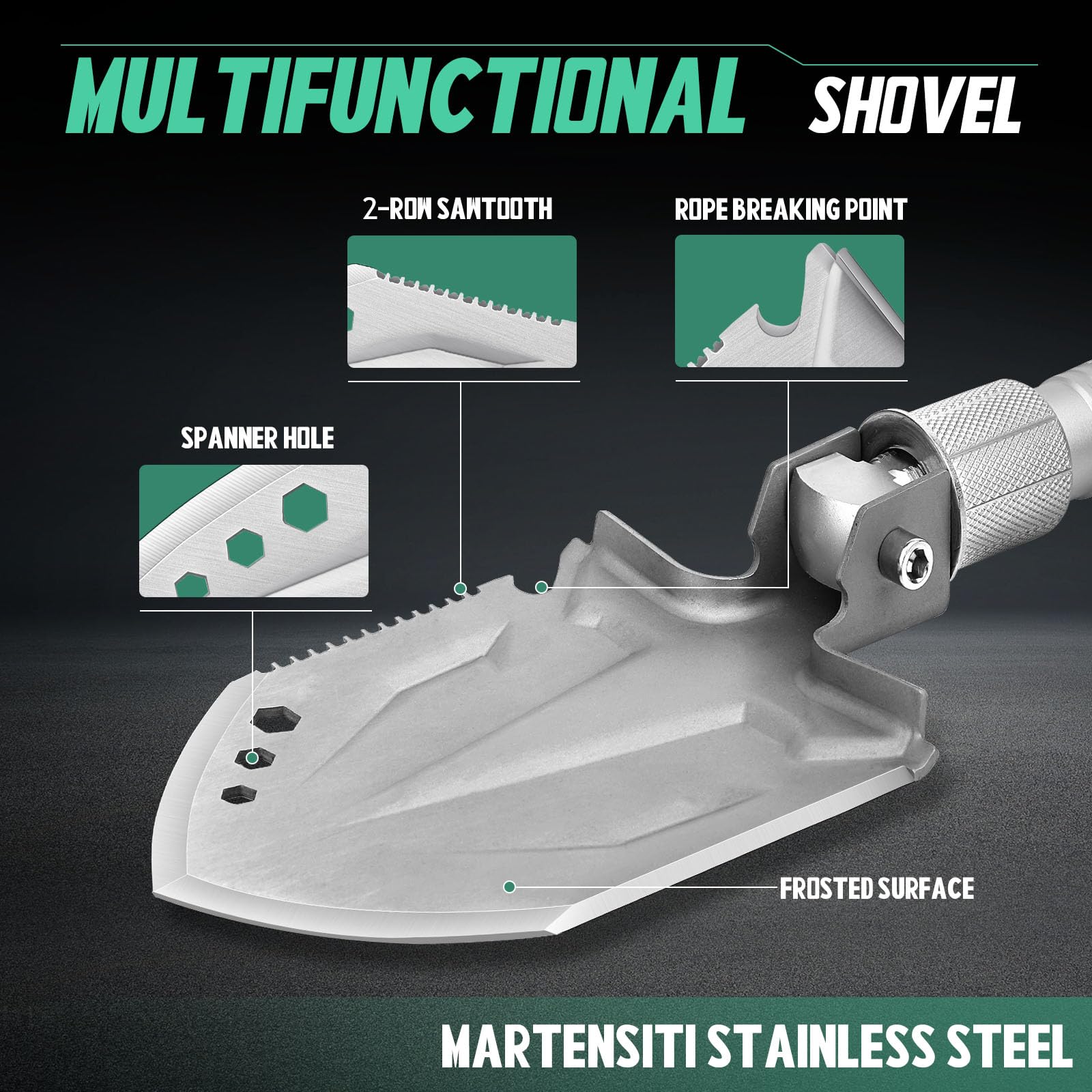 - Multifunctional folding shovel - This camping shovel can be freely rotated to fix the angle, and you can turn it into a hoe, hook or spade to meet your different needs. On the side of the folding spade there are sharp saw teeth and edges as well as three different sizes of wrench openings to complete tasks such as cutting branches, cutting ropes or screwing screws.