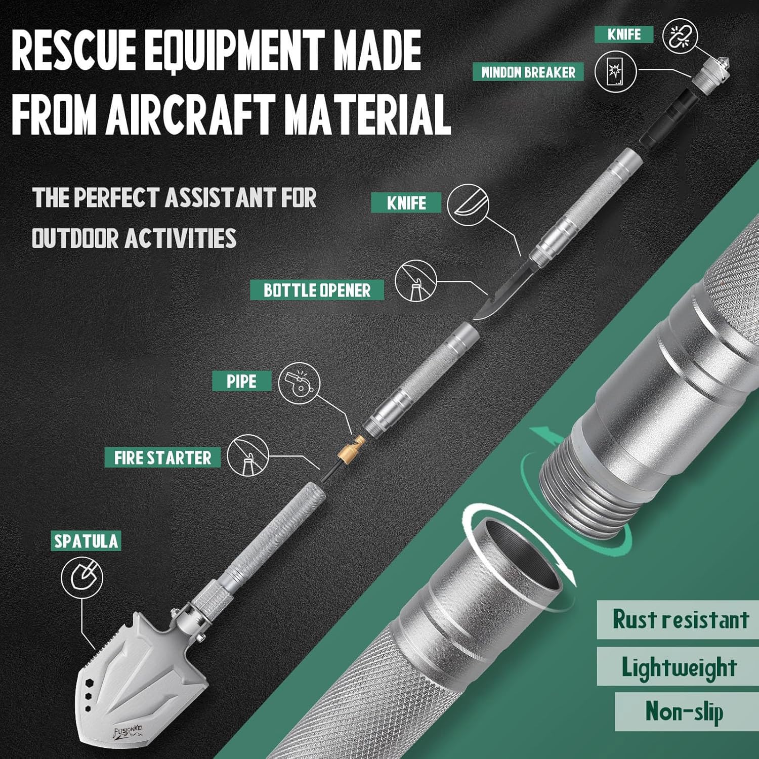 - Upgraded accessories - Unlike conventional products, all accessories and the extendable rod of the upgraded folding shovel are made of aviation aluminium alloy. The reinforced handle is sturdy and reliable, and the trapezoidal thread effectively prevents the handle from clamping. The anti-slip pattern on the surface of the handle prevents the spatula from slipping.