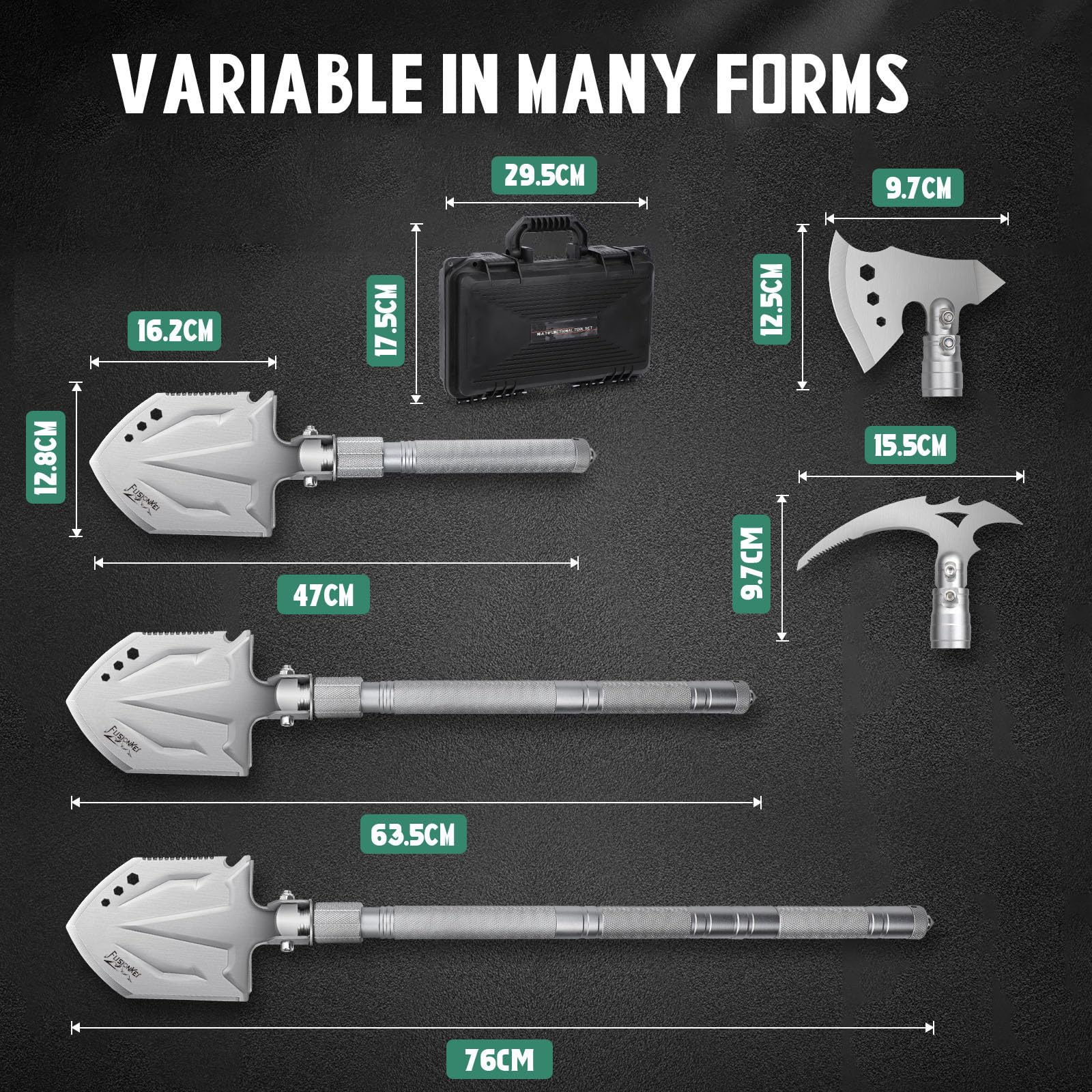 - Reliable strength – The folding shovel is made of high-quality steel and after hardening even stronger and more durable. The outdoor axe and pickaxe are also made of high-quality steel, so you don't have to worry about their strength.