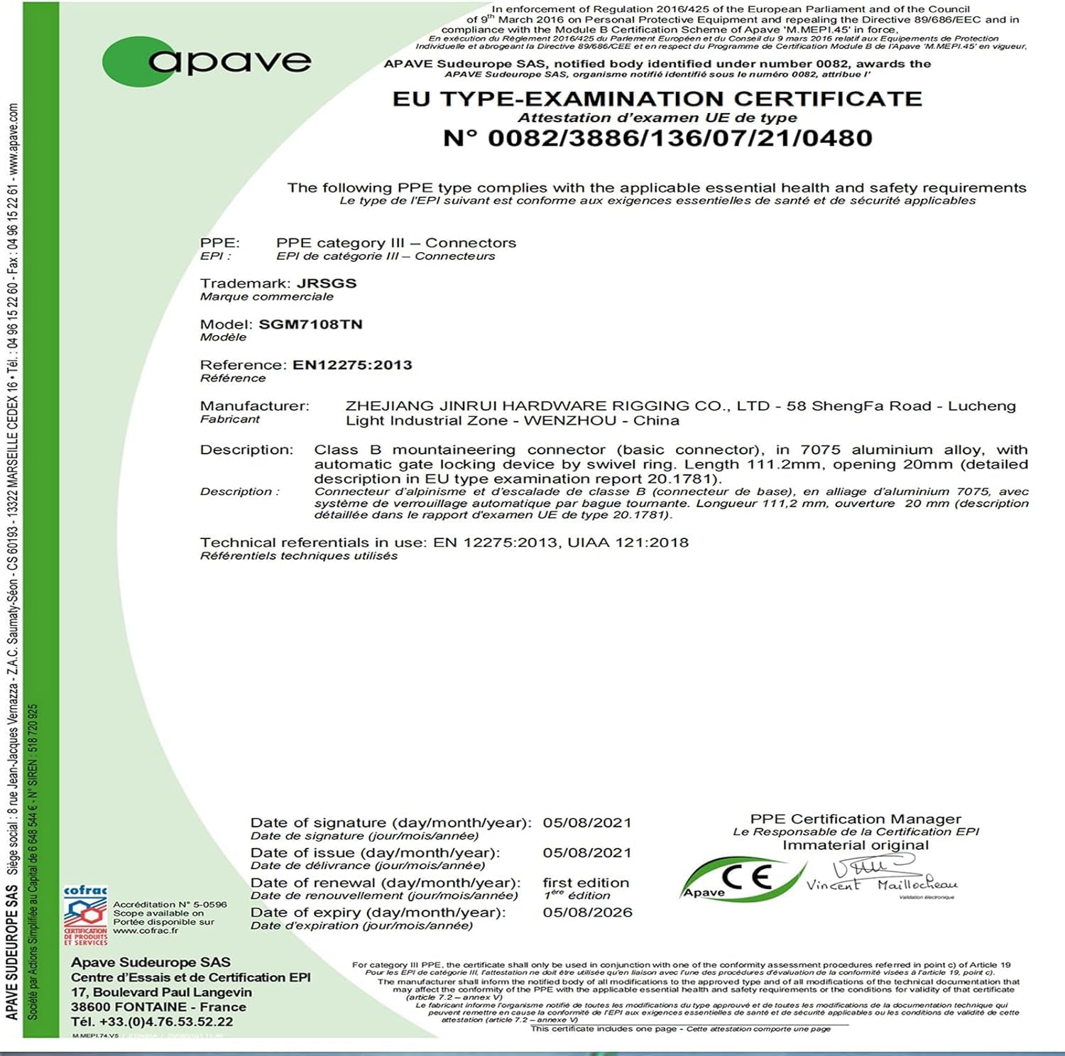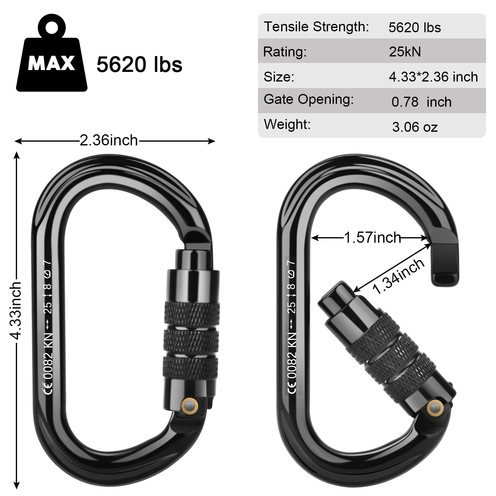 - 【CE Certificate Carabiner】CE certified, Major axis: 25kN (5,620lbs), Minor axis: 8kN, Open gate: 7kN. Hot forged construction rated for tree climbing, hiking, rappelling, rescue, locking big adult dogs, hammock, swing etc