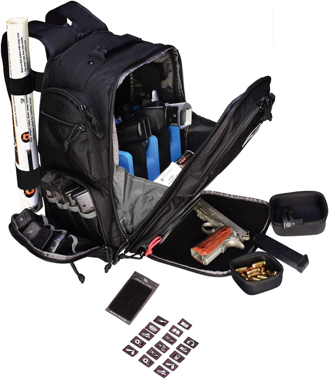 - REMOVABLE PATCHES - The Executive Backpack features 16 Removable Visual I.D. System patches; This allows shooter to customize where they want to store items; Icon patches can be placed anywhere helps to organize, store, and protect shooting accessories